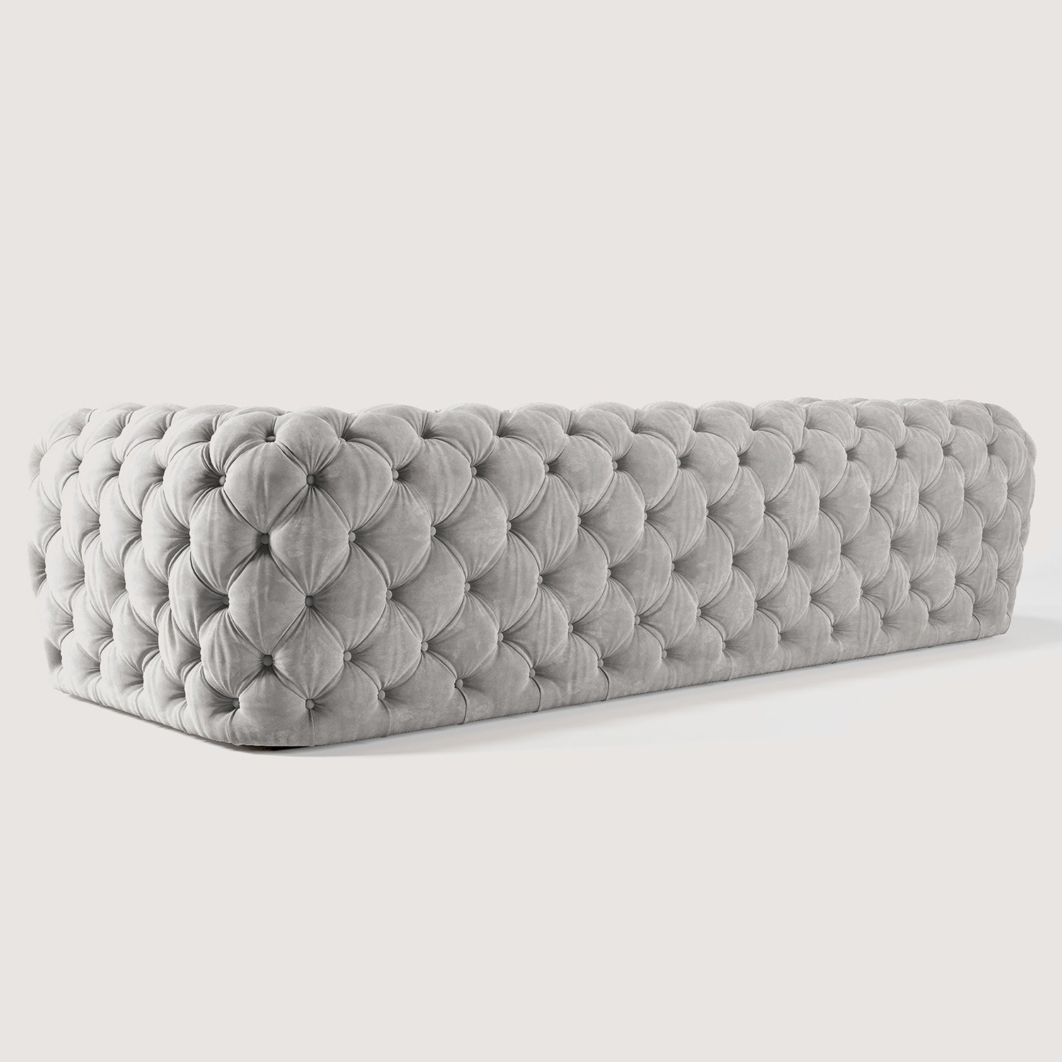 AVIGNON Kapitone Kanepe, komple kapitoneli kaplamasıyla . Geniş ve rahat bir oturmu vardır. Ahşap konstrüksiyon iskeleti, sünger üzeri birinci kalite döşemelik kumaş kaplanarak imal edilir. Ayakları metal üzeri fırın boyalıdır.