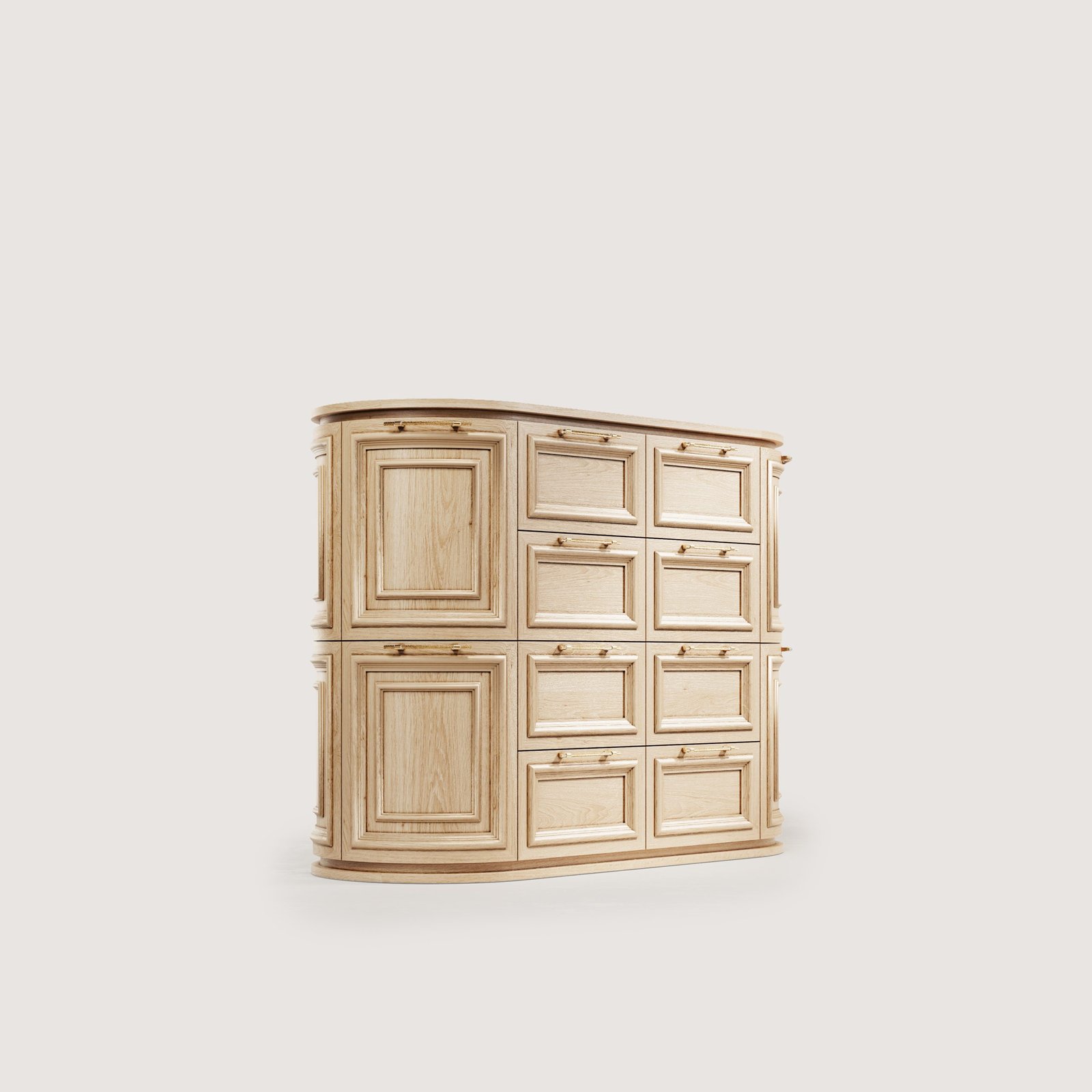 DUPONDE CIRCLE Şifonyer, klasik çizgileriyle country tarzda bir şifonyerdir. Bombeli yapısı şifonyere şık bir hava katarken meşe ağacının güzel dokusu ile rüstik bir görünüme sahiptir. El işçiliği ile üretilen şifonyerin gövde ve kapakları MDF üzeri doğal meşe kaplamalıdır. Çıta ve bordürleri ise masif meşe ağacından imal edilir. 8 çekmecelidir. Bombe yanları kapaklı dolaptır. Çekmeceleri tam açılım tandem raylıdır. Meşe ağacının güzel dokusunu öne çıkartmak için yüzeyde fırçalama işlemi uygulanır. Fırça izlerinin belirgin olması içinse yüzeyde monocoat ahşap yağı uygulaması yapılmaktadır. şifonyeri oluşturan kaliteli malzemeler ile sizden sonraki nesillere miras kalacak dayanımdadır. Kolaylıkla tamir edilebilmesi de şifonyerin, kullanım süresini artıran özelliklerindendir.