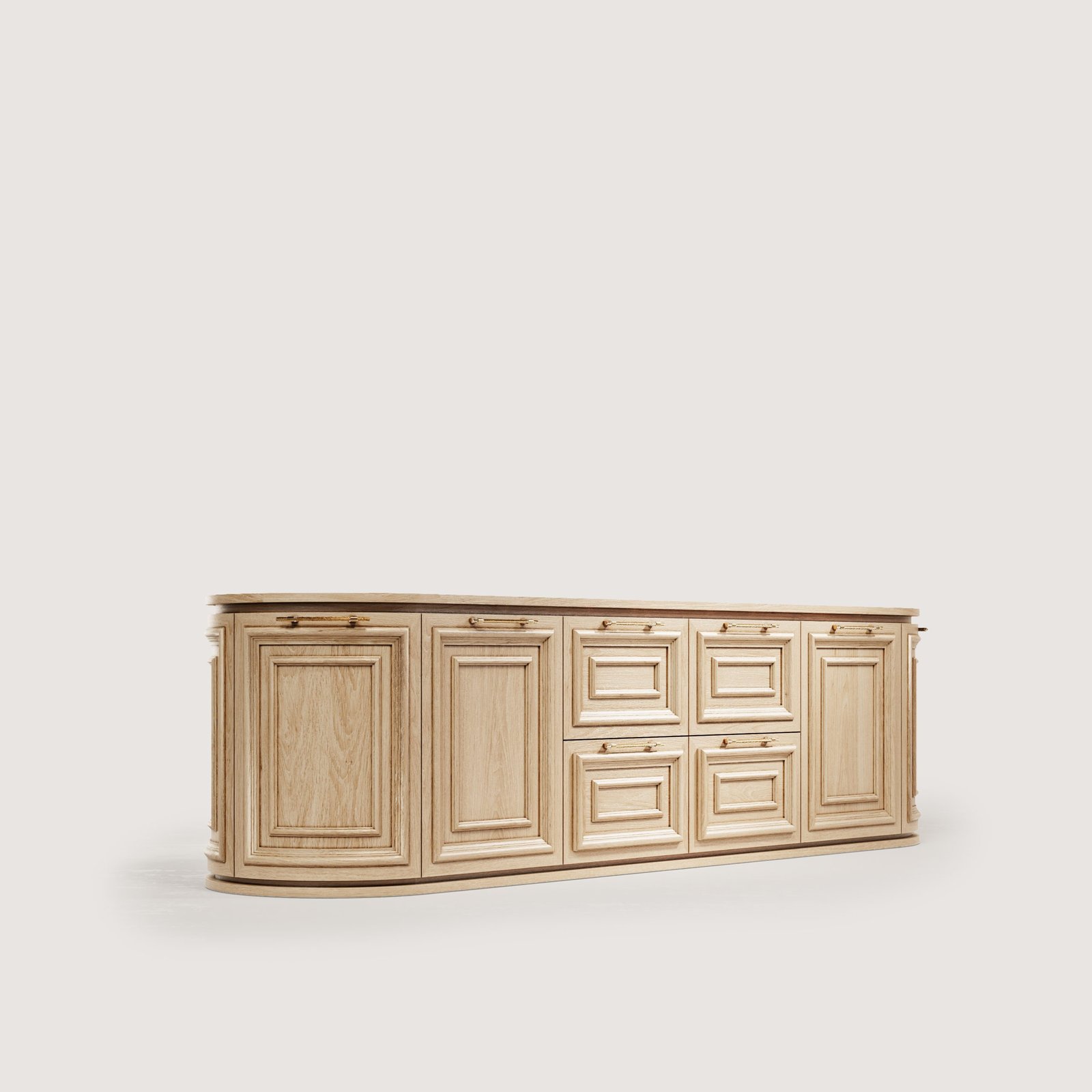 DUPONDE CIRCLE TV Sehpası, klasik çizgileriyle country tarzda bir TV sehpasıdır. Bombeli yapısı TV sehpasına şık bir hava katarken meşe ağacının güzel dokusu ile rüstik bir görünüme sahiptir. El işçiliği ile üretilen TV sehpasının gövde ve kapakları MDF üzeri doğal meşe kaplamalıdır. Çıta ve bordürleri ise masif meşe ağacından imal edilir. Orta kısmı 4 çekmeceli, yan kısımları kapaklı dolaptır. Çekmeceleri tam açılım tandem raylıdır. Meşe ağacının güzel dokusunu öne çıkartmak için yüzeyde fırçalama işlemi uygulanır. Fırça izlerinin belirgin olması içinse yüzeyde monocoat ahşap yağı uygulaması yapılmaktadır. TV sehpasını oluşturan kaliteli malzemeler ile sizden sonraki nesillere miras kalacak dayanımdadır. Kolaylıkla tamir edilebilmesi de TV sehpasının, kullanım süresini artıran özelliklerindendir.