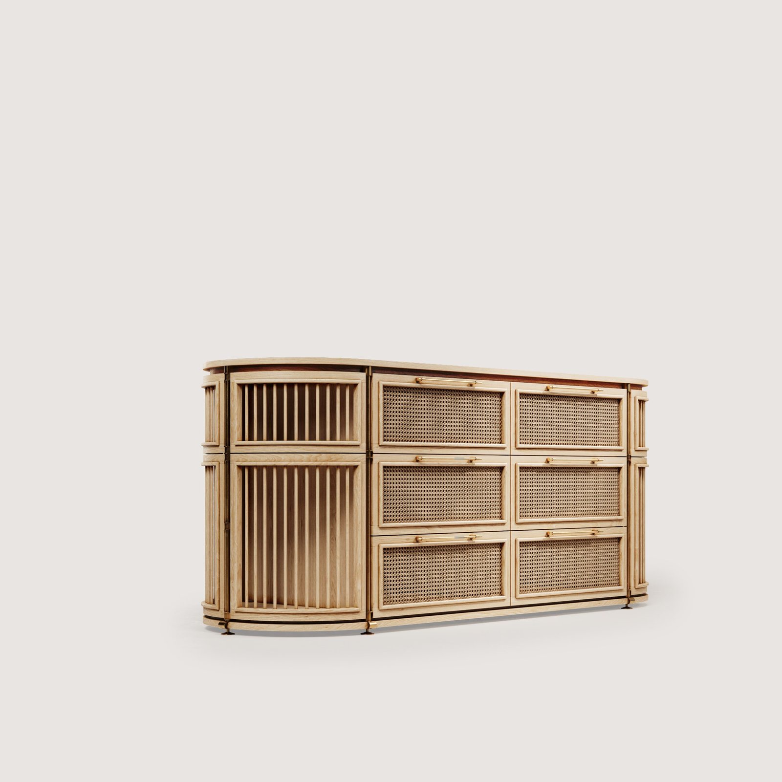 JAKARTA CIRCLE Şifonyer, rustik tasarıma sahip bir dolaptır. Yanlarındaki ahşap çubuklar şifonyere heyecan verici bir görünüm katar. Bu ahşap çubuklar, doğal meşe ağacından imal edilirler. Şifonyere özel tasarıma sahip metal aksesuarları ile de dolabımız, zengin detaylara sahiptir. Dolabın, sağ ve sol yanlarından ortasında boylu boyunca uzanan metal miller, menteşe görevi görmektedirler. Kapakları merkezde kavuştuğu yerdeki mil ise raflara, taşıyıcı destek görevi görür. Çekmece klapalarındaki hazeranlar ve metal kulpları dolaba zarif bir görünüm vermektedirler. Şifonyer, 6 çekmeceli ve yanları 4 kapaklıdır. Çekmecelerde tam açılım tandem ray kullanılır. Meşe ağacının güzel dokusunu öne çıkartmak için yüzeyde fırçalama işlemi uygulanır. Fırça izlerinin belirgin olması içinse yüzeyde monocoat ahşap yağı uygulaması yapılmaktadır. Şifonyeri oluşturan kaliteli malzemeler ile sizden sonraki nesillere miras kalacak dayanımdadır. Kolaylıkla tamir edilebilmesi de dolabın, kullanım süresini artıran özelliklerindendir.