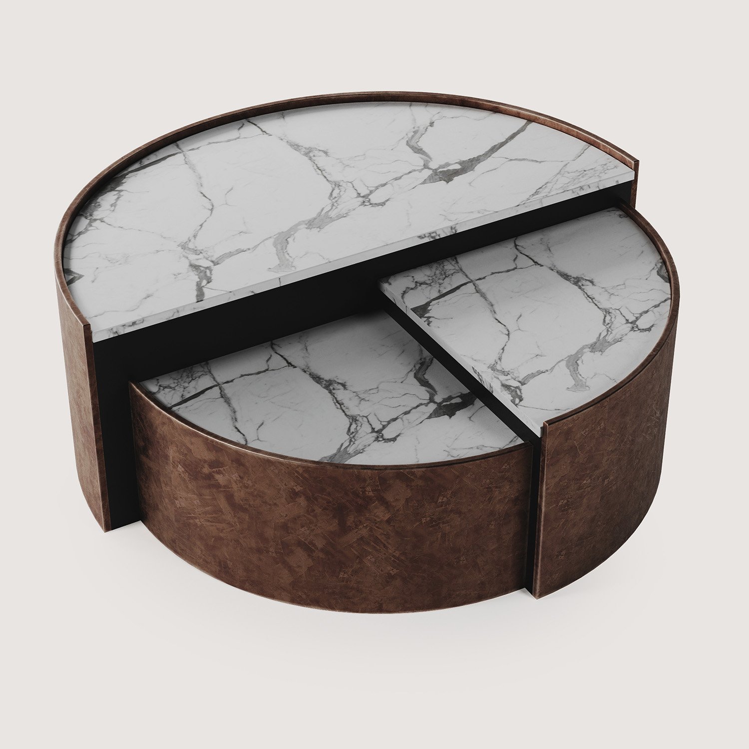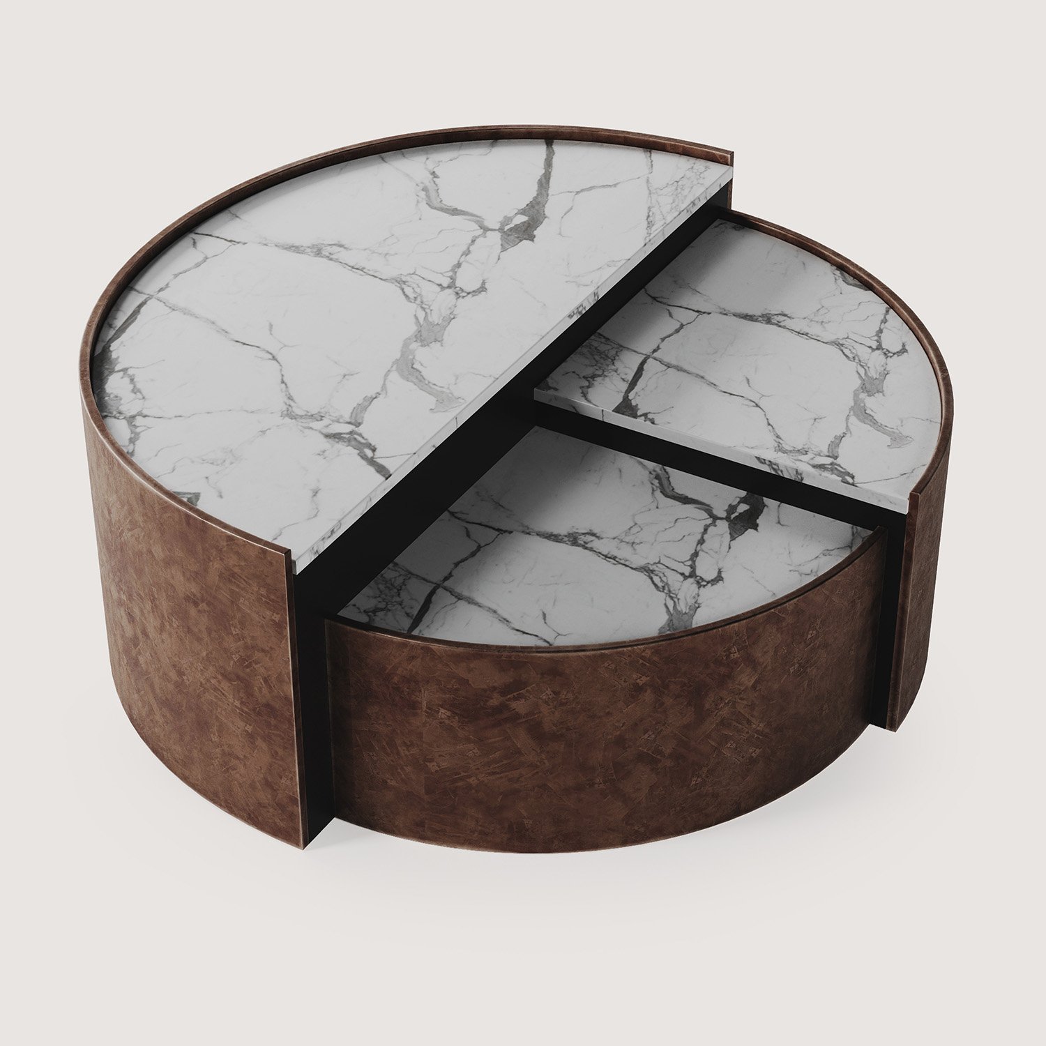 Jota serisi orta sehpa, haraketli tasarımı ile oturma odalarınıza heyecan verici bir görünüm katar. Sehpa, birbirlerinden bağımsız hareket edebilen seyyar 3 parçadan oluşur. Gövde MDF üzeri özel boya ve boyama tekniği ile renklendirilerek metalik patine bir dokuya sahiptir.Tablası mermerdir.