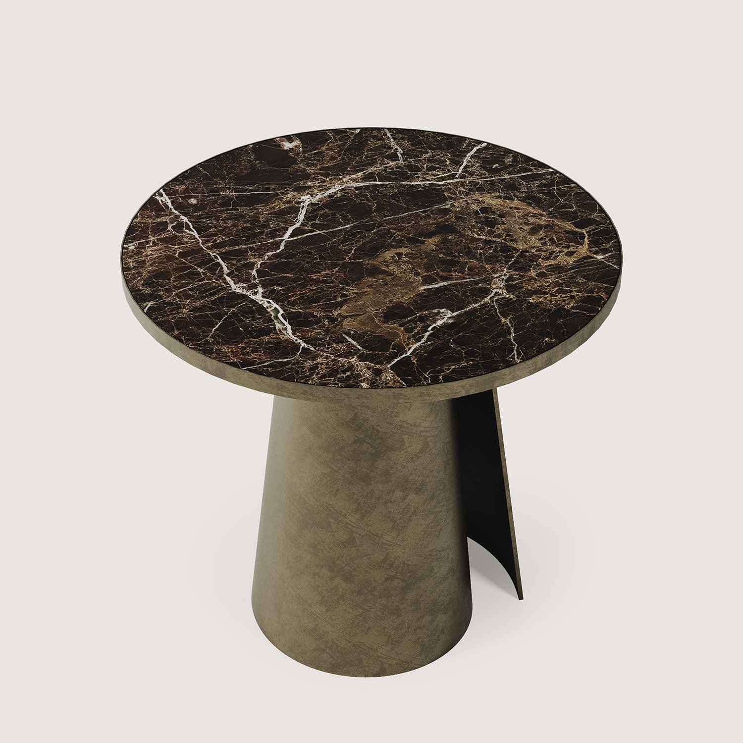 Mila yan sehpa, koltuk, kanepe ve karyola yanında kullanıma uygundur. Ahşap gövdeli ayağında uyguladığımız metal efektli özel boya ve boyama tekniği ile blok bir metal görünümü verir. Tablası mermerdir.