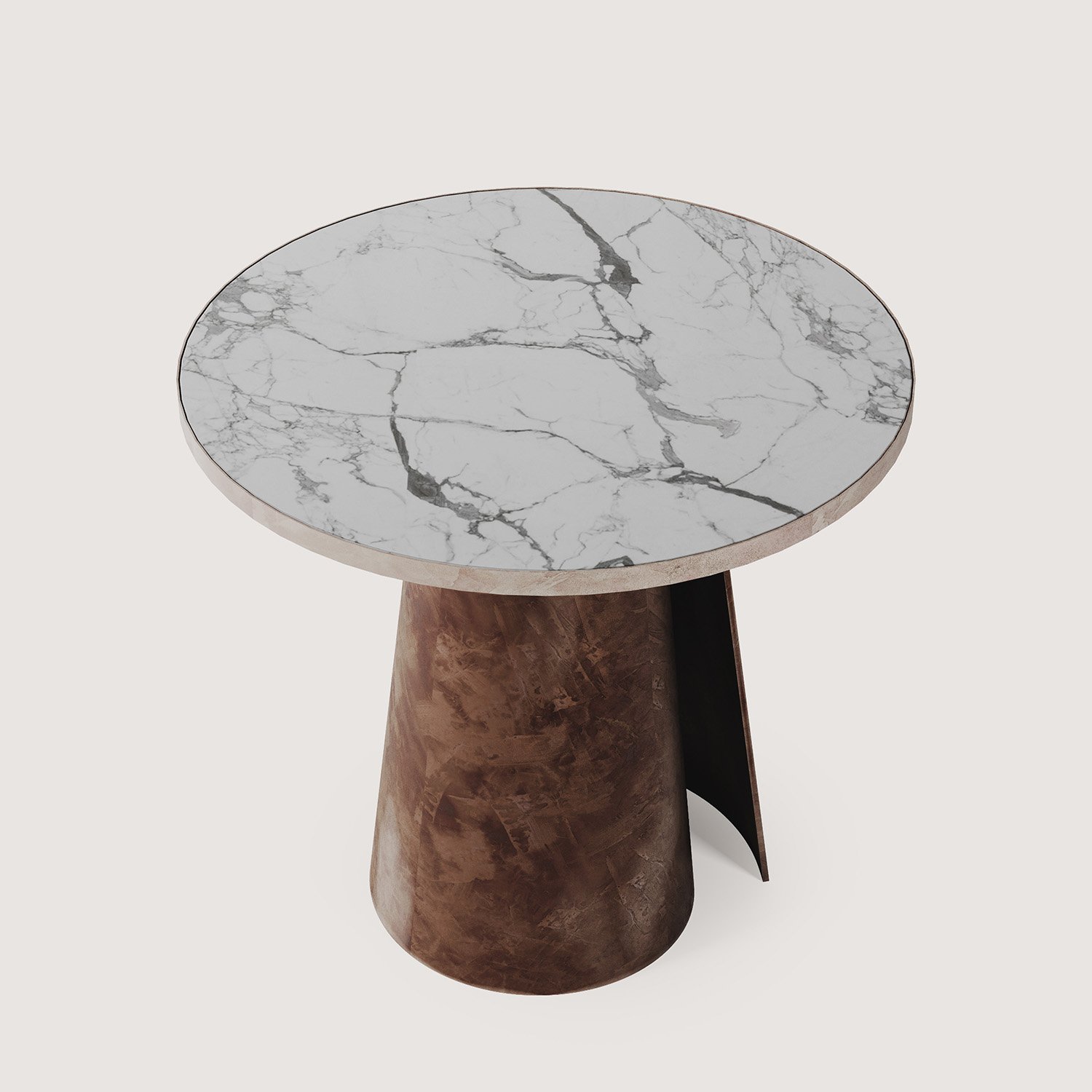 Mila yan sehpa, koltuk, kanepe ve karyola yanında kullanıma uygundur. Ahşap gövdeli ayağında uyguladığımız metal efektli özel boya ve boyama tekniği ile blok bir metal görünümü verir. Tablası mermerdir.