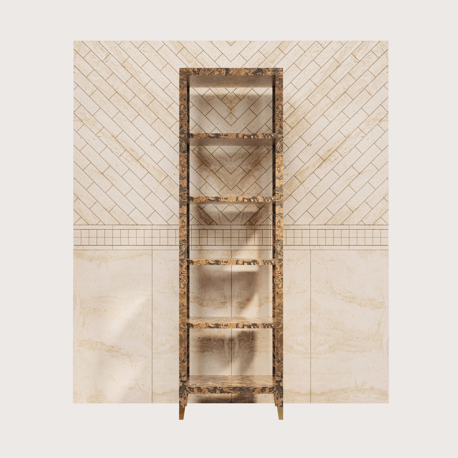 NEW ENGLAND CALIFORNIA BURL Banyo Rafı, düz hatlarıyla minimal tarzda bir mobilyadır. Gold renk metal ayak pabuçları ile zarif bir görünümü vardır. Tüm yüzeylerde kullanılan kök kaplamanın güzelliği banyo dolabına özel bir görünüm katmaktadır. Bu kök kaplama İtalyan Alpi markasının lignum serisi olan özel bir ağaç kaplama türüdür. 5 raflıdır.