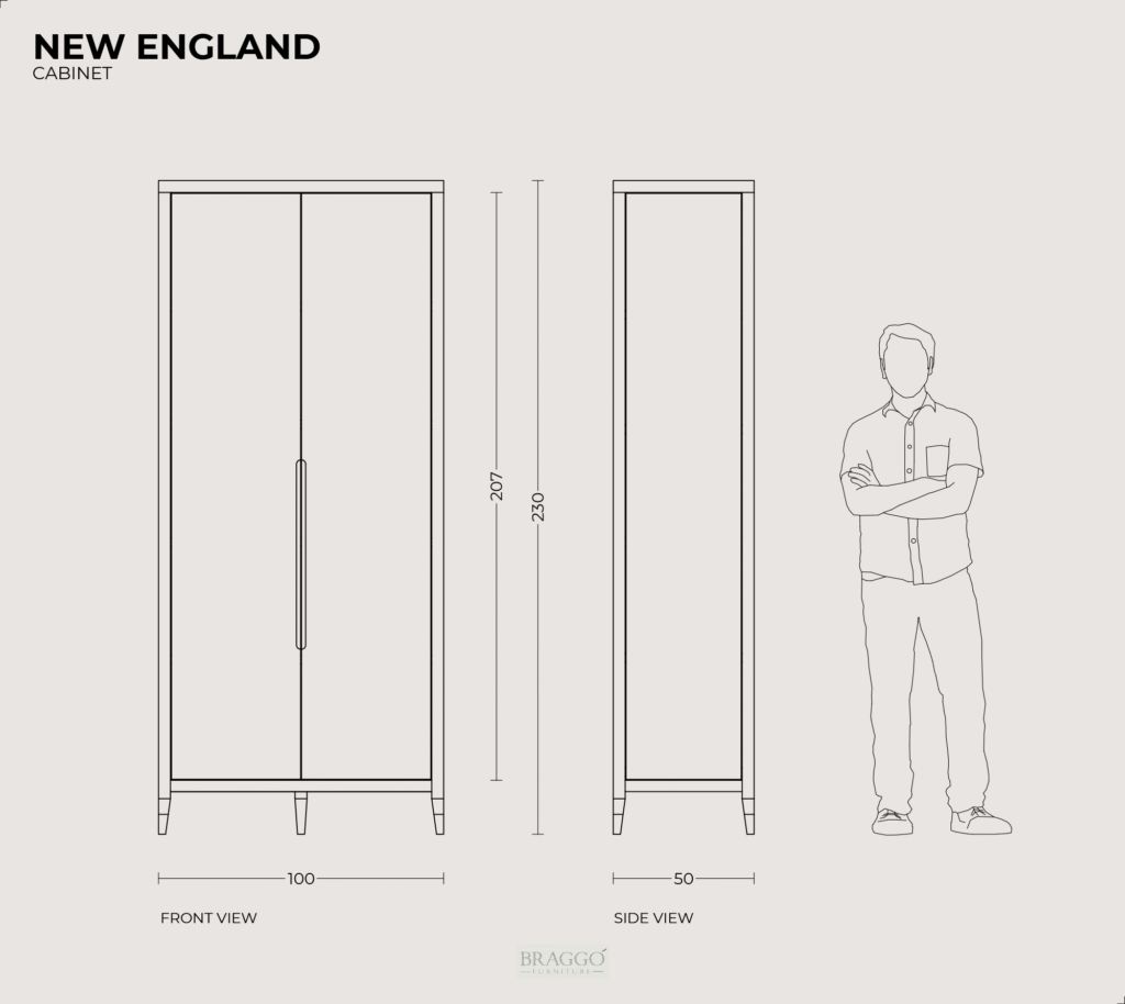 NEW ENGLAND CALIFORNIA BURL boy dolap, gold renk gömme kanal kulp detayı ve metal ayak pabuçları ile zarif bir görünümü vardır. Tüm yüzeylerde kullanılan kök kaplamanın güzelliği dolaba özel bir görünüm katmaktadır. Bu kök kaplama İtalyan Alpi markasının lignum serisi olan özel bir ağaç kaplama türüdür. İç bölümü 5 raflıdır.