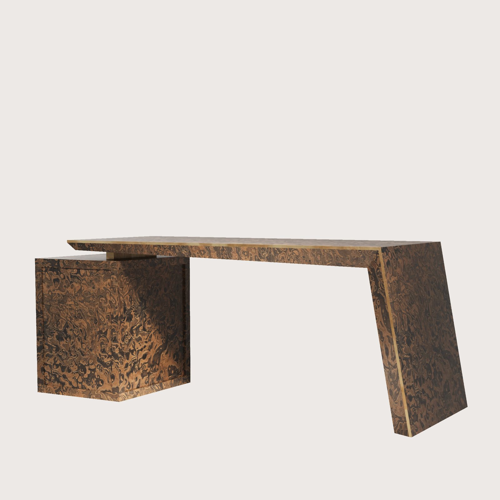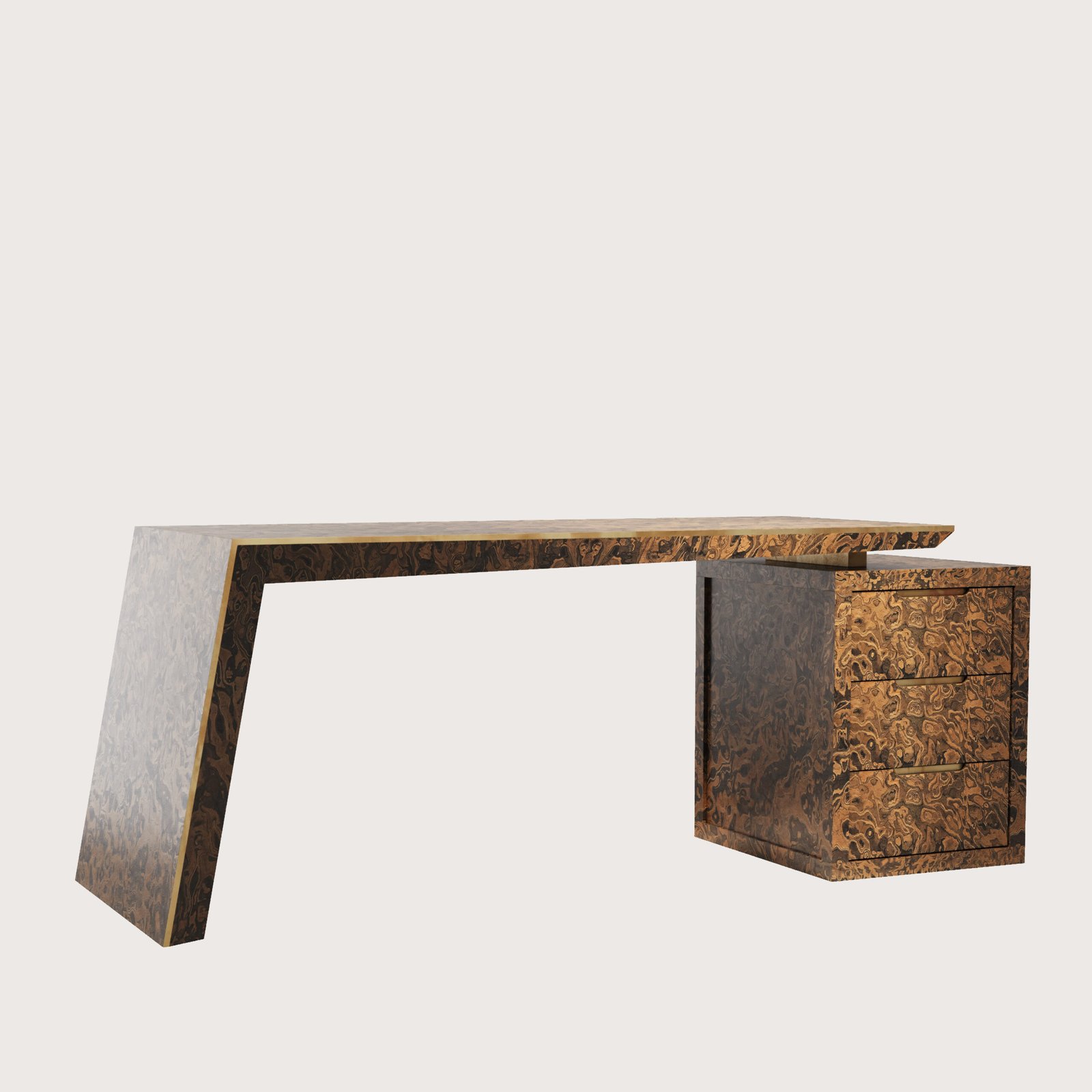 NEW ENGLAND CALIFORNIA BURL Ofis Masası, tablasının özel tasarımı ile heyecan verici bir görünüme sahiptir. Tablanın mono blok formu içi demir konstrüksiyon ile desteklenmiştir ve son derece sağlamdır. Tabla üstü ve çekmece klapaları İtalyan ALPI markasının özel serisinden olan “California Burl” ahşap kaplaması ile yapılmıştır. Tabla üstünde evrak ve kalem saklamak için gizli kapağı vardır. Kesonu 3 çekmelidir. Çekmeceler tam açılım tandem raylıdır.