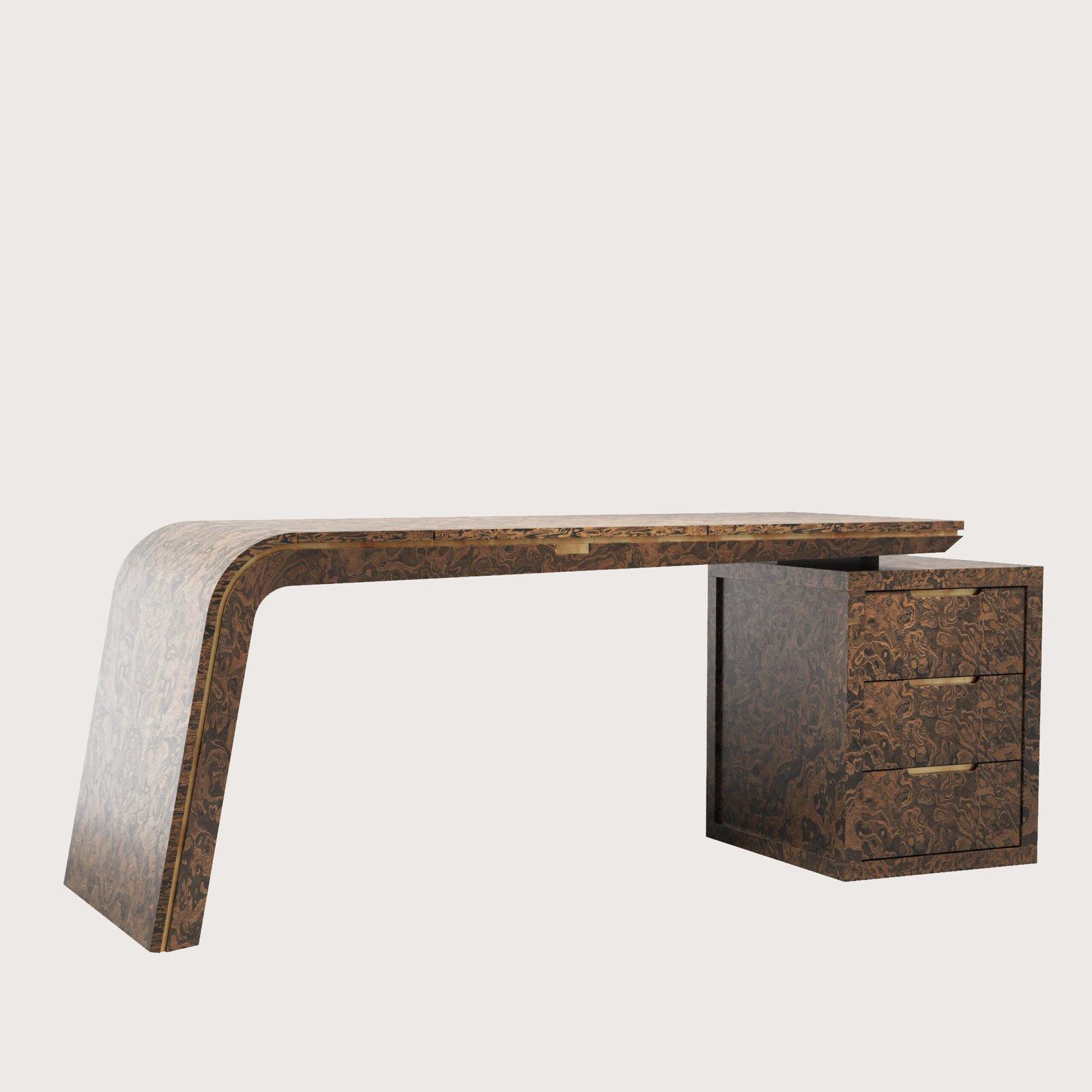 NEW ENGLAND CALIFORNIA BURL Ofis Masası, tablasının özel tasarımı ile heyecan verici bir görünüme sahiptir. Tablanın mono blok formu içi demir konstrüksiyon ile desteklenmiştir ve son derece sağlamdır. Tabla üstü ve çekmece klapaları İtalyan ALPI markasının özel serisinden olan “Burl Elm” ahşap kaplaması ile yapılmıştır. Tabla üstünde evrak ve kalem saklamak için gizli kapağı vardır. Kesonu 3 çekmelidir. Çekmeceler tam açılım tandem raylıdır.