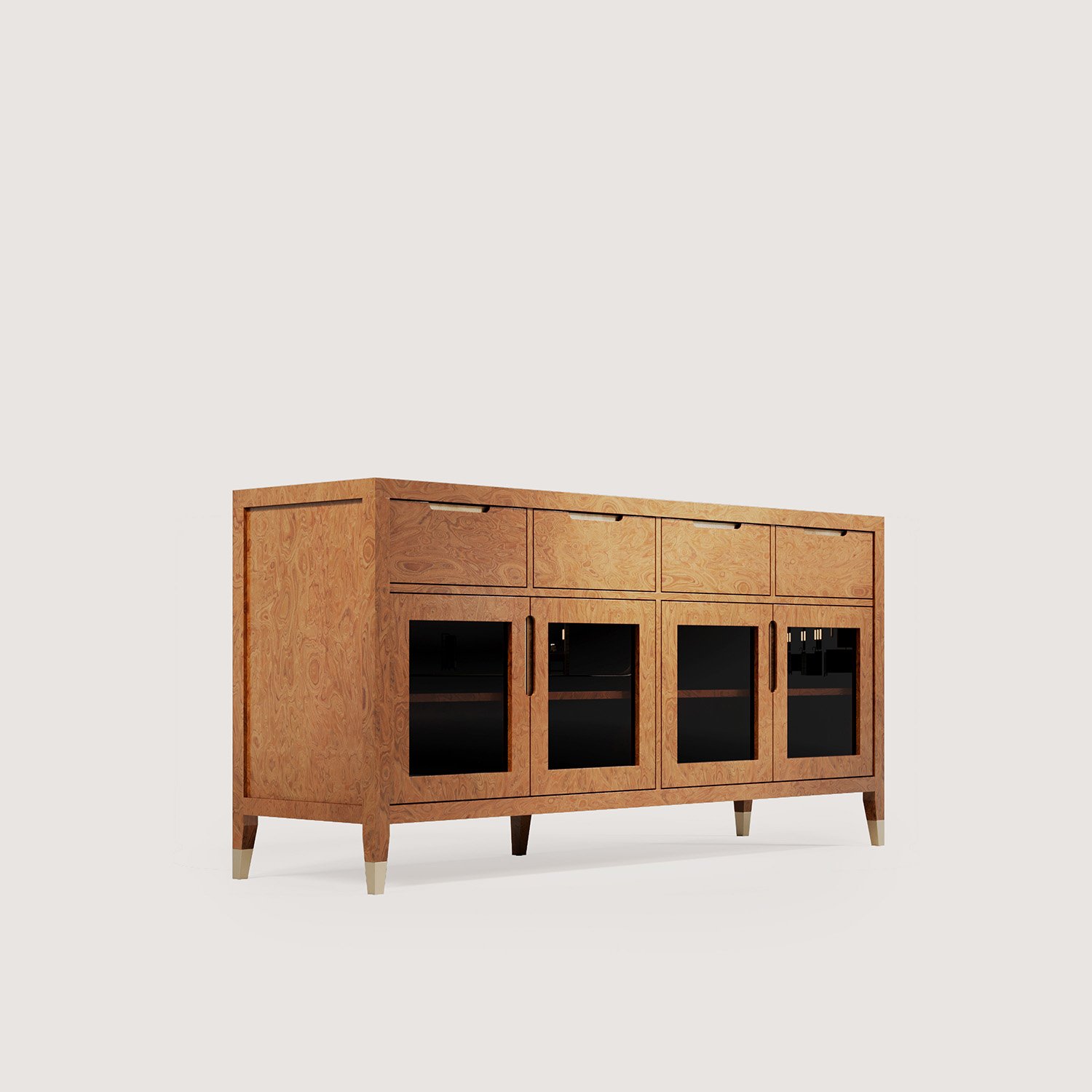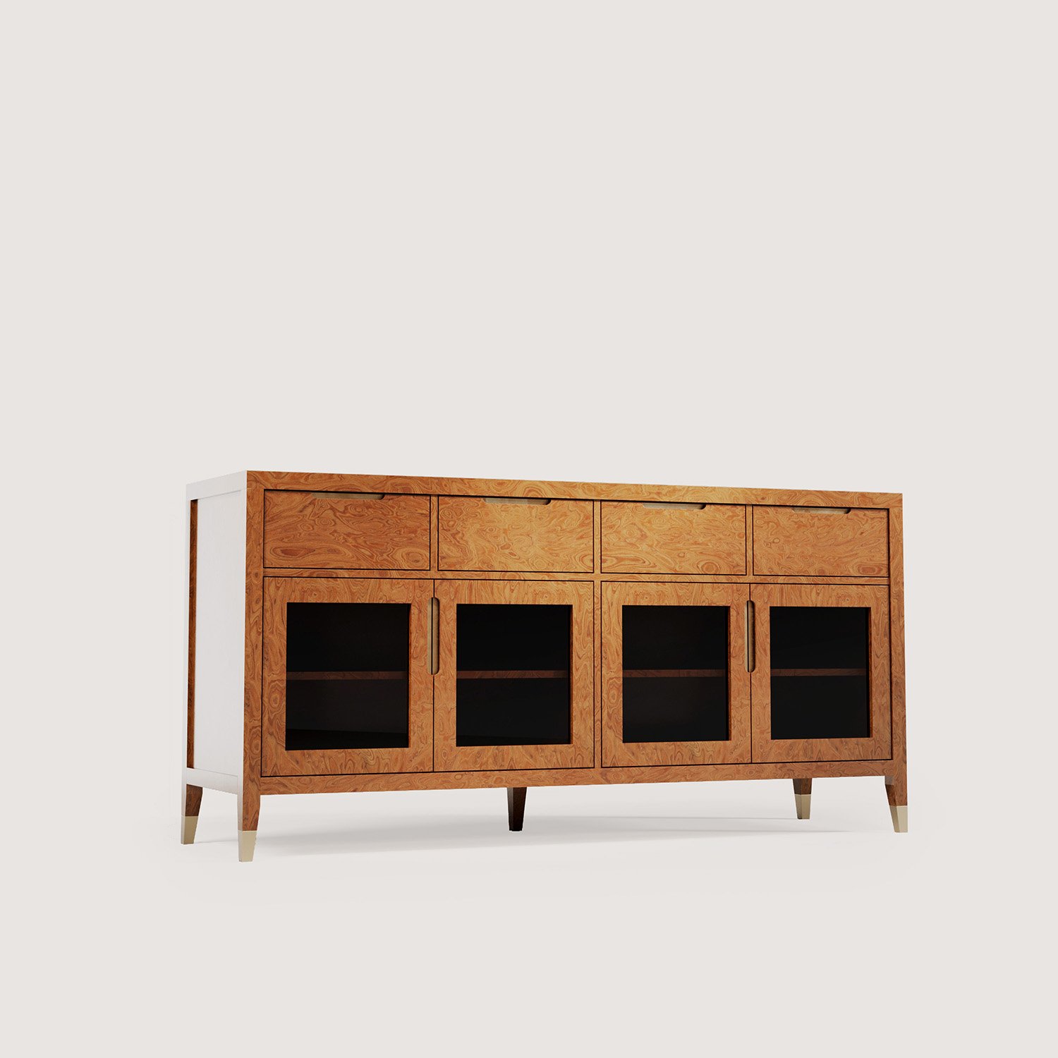 NEW ENGLAND ELM Konsol, cam kapakları ve gold renk gömme kanal kulp detayı ve metal ayak pabuçları ile zarif bir görünümü vardır. Tüm yüzeylerde kullanılan kök kaplamanın güzelliği konsola özel bir görünüm katmaktadır. Bu kök kaplama İtalyan Alpi markasının lignum serisi olan özel bir ağaç kaplama türüdür. 4 çekmeceli ve 4 cam kapaklıdır. Çekmeceler, tam açılım tandem raylıdır. Camlar bronz renk ve kırılmaya dayanımlı temperlidir.
