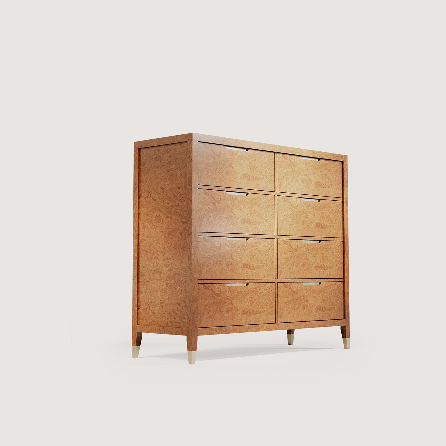 NEW ENGLAND ELM 8 Çekmeceli Şifonyer, Gold renk gömme kanal kulp detayı ve gold renk metal ayak pabuçları ile zarif bir görünümü vardır. Tüm yüzeylerde kullanılan kök kaplamanın güzelliği şifonyere özel bir görünüm katmaktadır. Bu kök kaplama İtalyan Alpi markasının lignum serisi olan özel bir ağaç kaplama türüdür. 8 çekmecelidir. Çekmeceler, tam açılım tandem raylıdır.