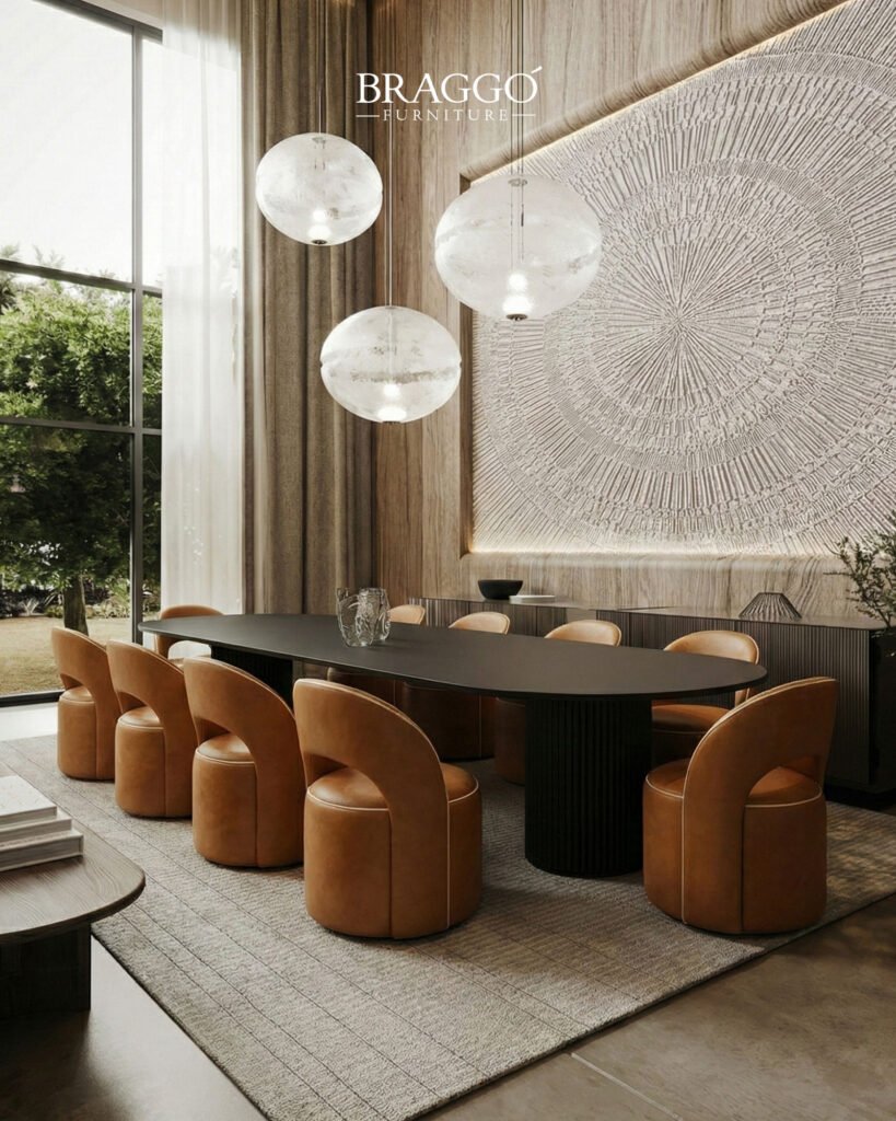Yüksek kaliteli deri kaplaması, formun bütünlüğünü güçlendirirken yüzeyde sakin ve rafine bir etki oluşturur. ORBA, modern ve lüks yemek odalarında mekâna sıcak bir karakter kazandıran, yalın ama güçlü bir atmosfer oluşturan bir yemek masası sandalyesi olarak öne çıkar.