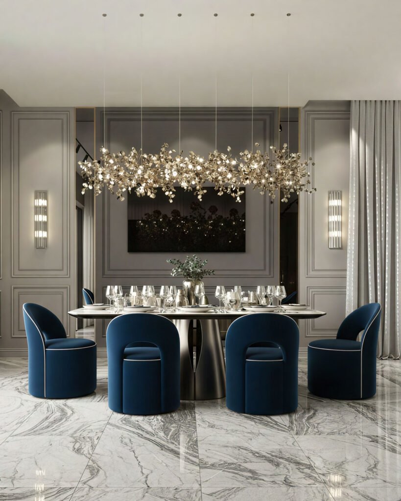 Yüksek kaliteli kadife kaplama, yüzeyde sakin bir derinlik oluşturarak tasarımın bütüncül yapısını güçlendirir. ORBA, modern ve lüks yemek odalarında mekâna huzurlu, dengeli ve rafine bir atmosfer kazandıran bir yemek masası sandalyesidir.