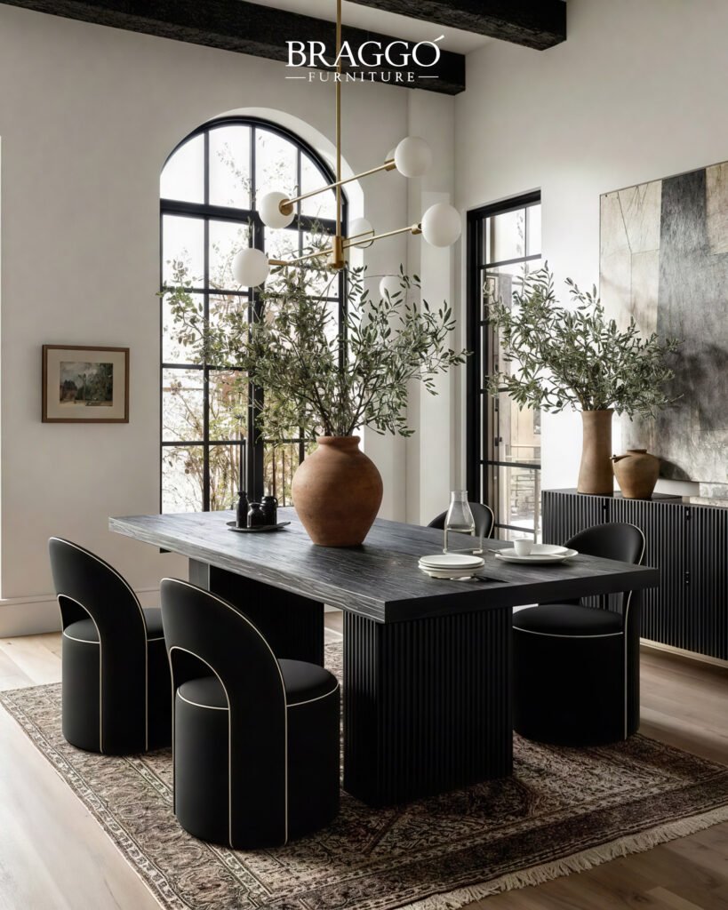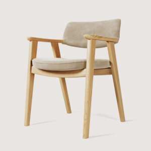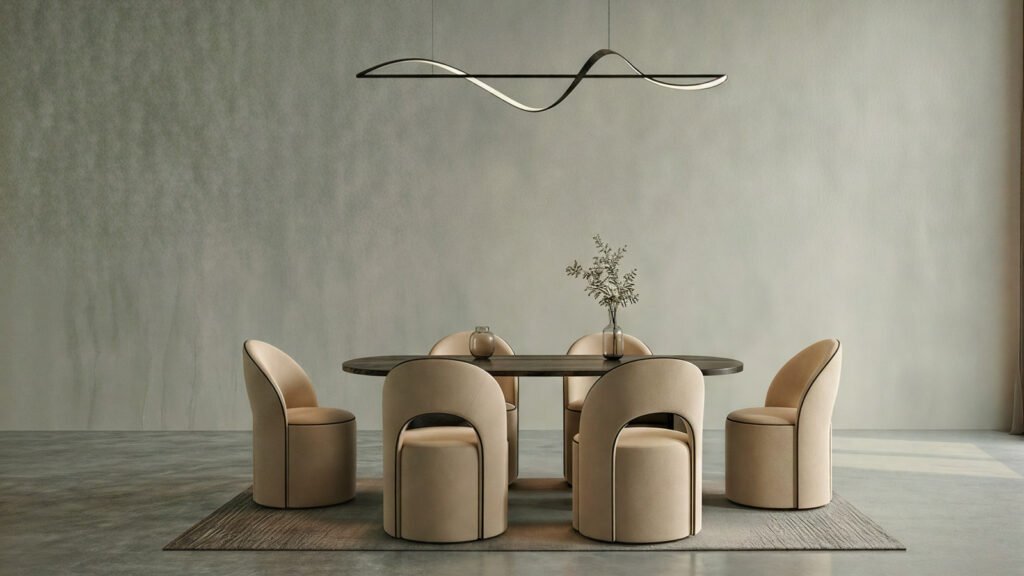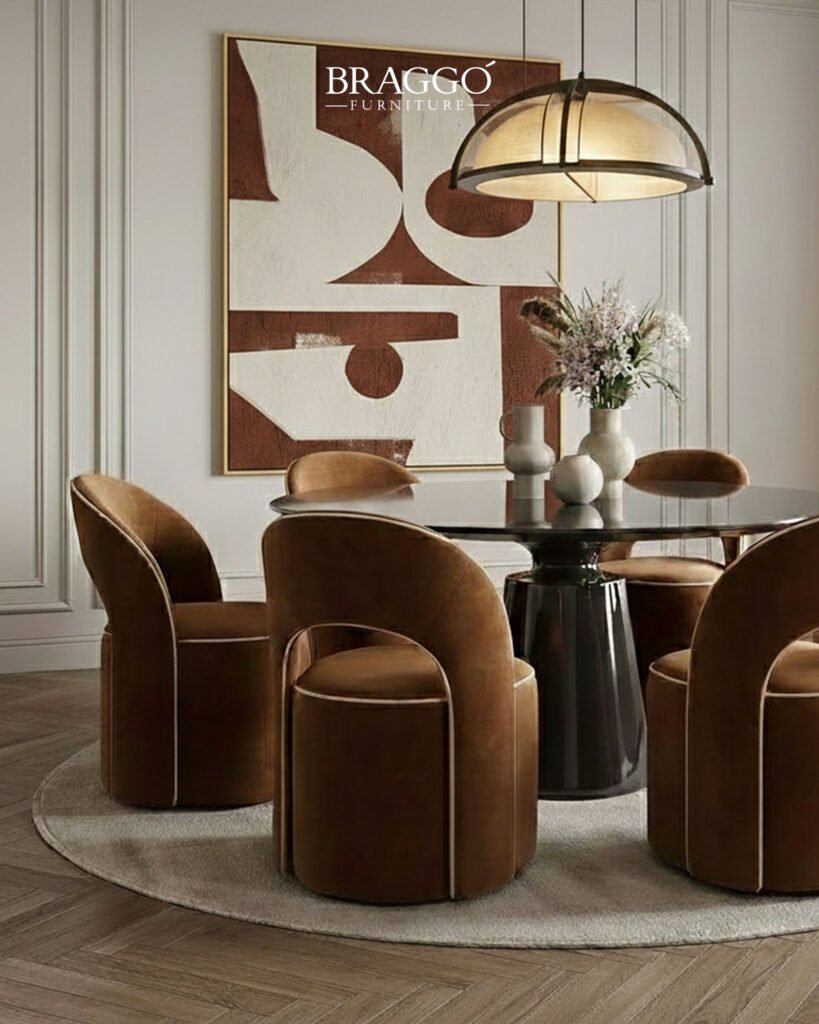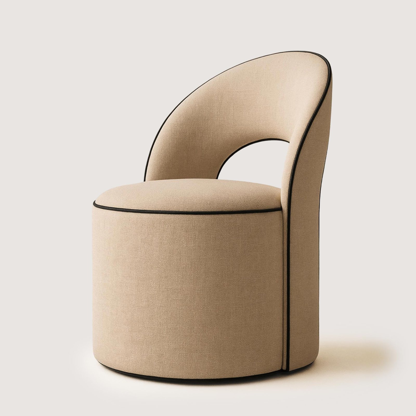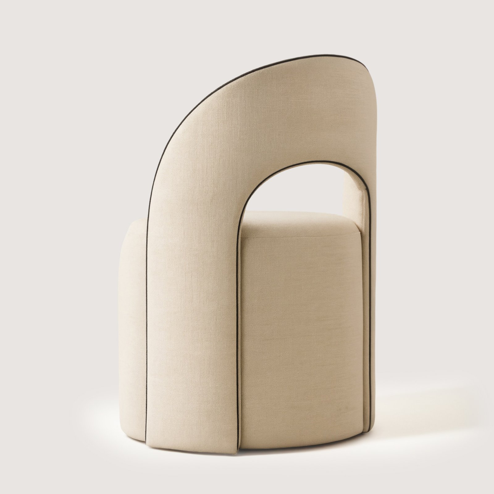 Yüksek kaliteli kumaş yüzey, tasarımın bütüncül yapısını desteklerken mekânda yumuşak bir görsel denge oluşturur. ORBA, modern ve lüks yemek odalarında samimi, dengeli ve rahat bir atmosfer sunan bir yemek masası sandalyesidir.