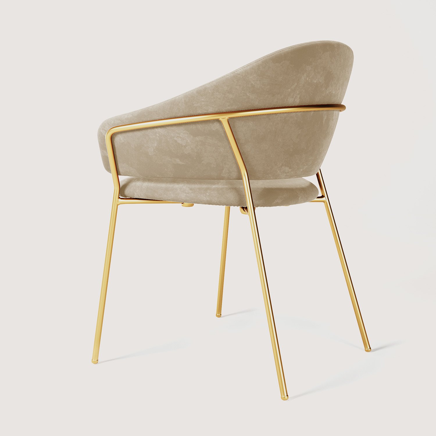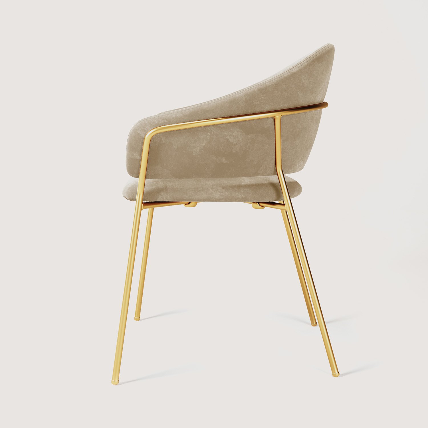 Peta serisi metal sandalye, modern bir tasarıma sahiptir. Ayakları, pirinç boyalı metalden imal edilir. Kadife kumaştan imal edilen minder ve sırtlığı ile zarif bir görünüme sahiptir.