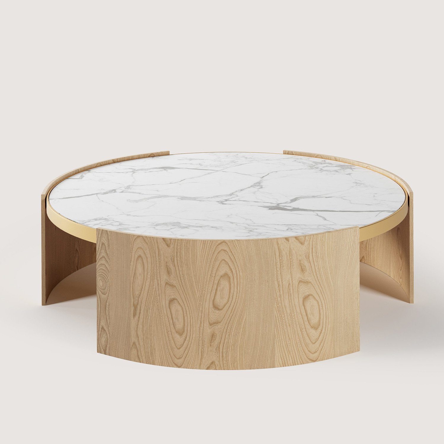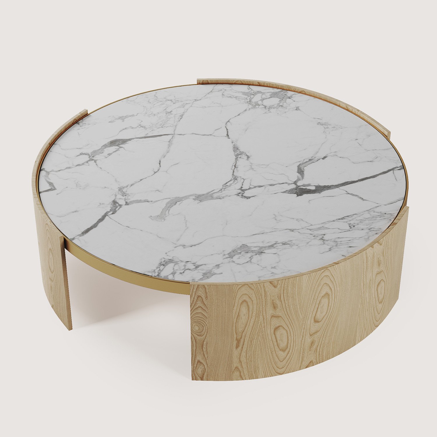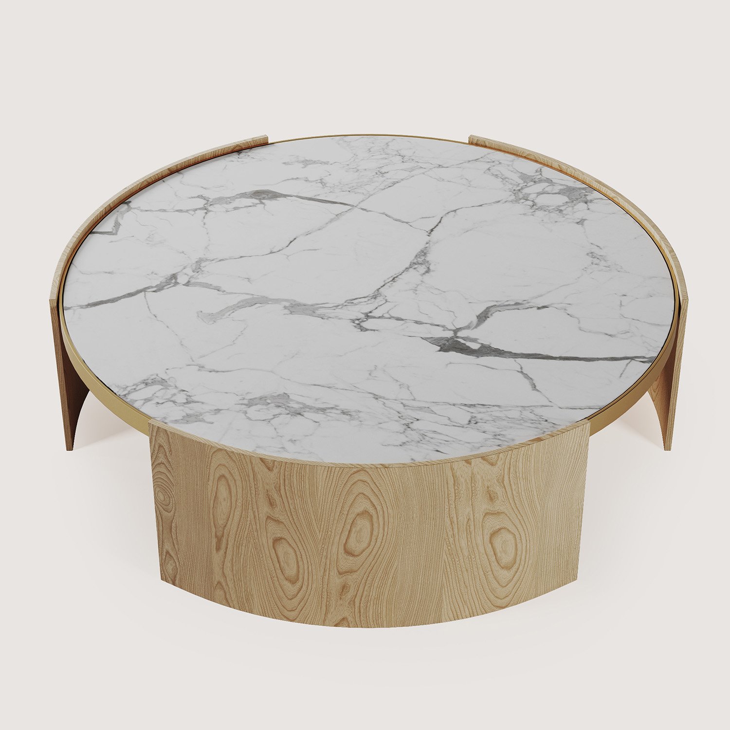 Qua serisi orta sehpa, modern ve minimal görünümü ile oturma odaları için şık bir tamamlayıcıdır. Ayakları, MDF üzeri doğal meşe kaplamalıdır.Tablası mermerdir. Tabla cumbalarındaki pirinç boyalı metal bant detayı sehpaya zarif bir görünüm katar.