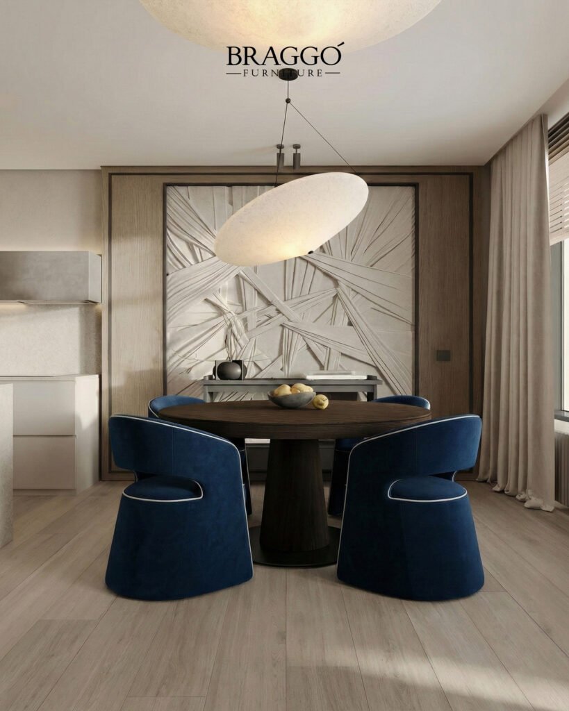 Yüksek kaliteli kadife kaplama, dokusuyla ışığı yumuşak biçimde kırar ve formun akıcılığını vurgular. TOLA, modern ve lüks yemek odalarında mekâna sofistike, sıcak ve rafine bir atmosfer kazandıran bir yemek masası sandalyesidir.