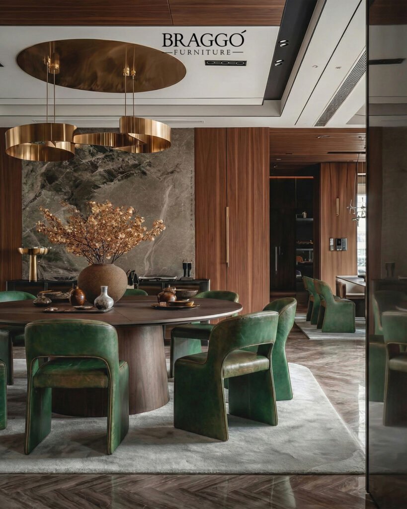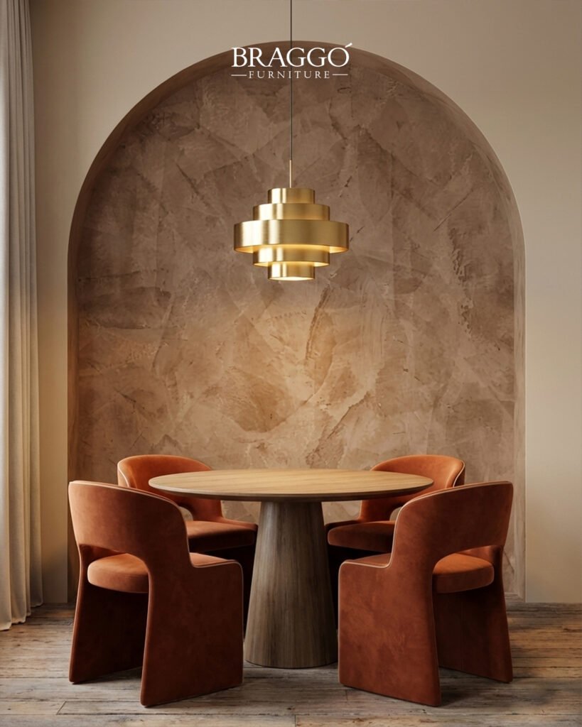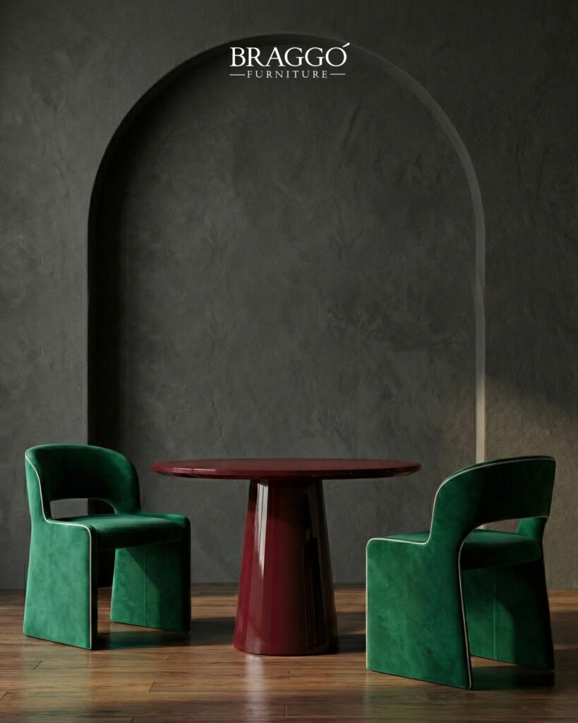 Yüksek kaliteli kadife kaplama, dokusuyla ışığı yumuşak biçimde kırar ve formun akıcılığını vurgular. TOLA, modern ve lüks yemek odalarında mekâna sofistike, sıcak ve rafine bir atmosfer kazandıran bir yemek masası sandalyesidir.