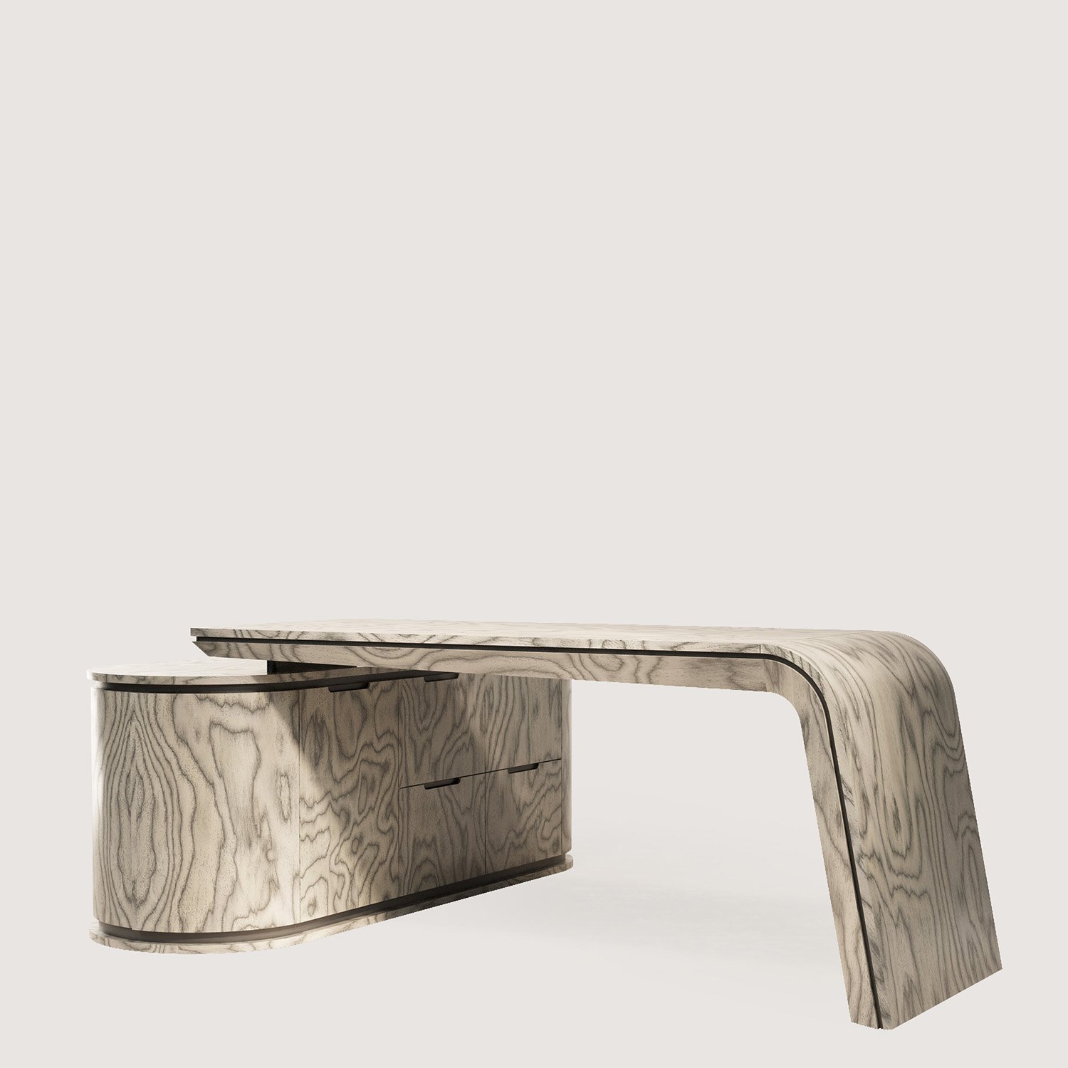 VEGAS E SOTTSASS Ofis Masası, tablasının özel tasarımı ile heyecan verici bir görünüme sahiptir. Tablanın mono blok formu içi demir konstrüksiyon ile desteklenmiştir ve son dercee sağlamdır. Tabla üstü ve çekmece klapaları İtalyan ALPI markasının özel serisinden olan “Ettore Sottrass Grey” ahşap kaplaması ile yapılmıştır. Tabla üstünde evrak ve kalem saklamak için gizli kapağı vardır. Tabla altı ve kesonu mat lake cilalıdır. Kesonu 4 çekmeli ve tek kapaklı dolaplıdır. Çekmeceler tam açılım tandem raylıdır.