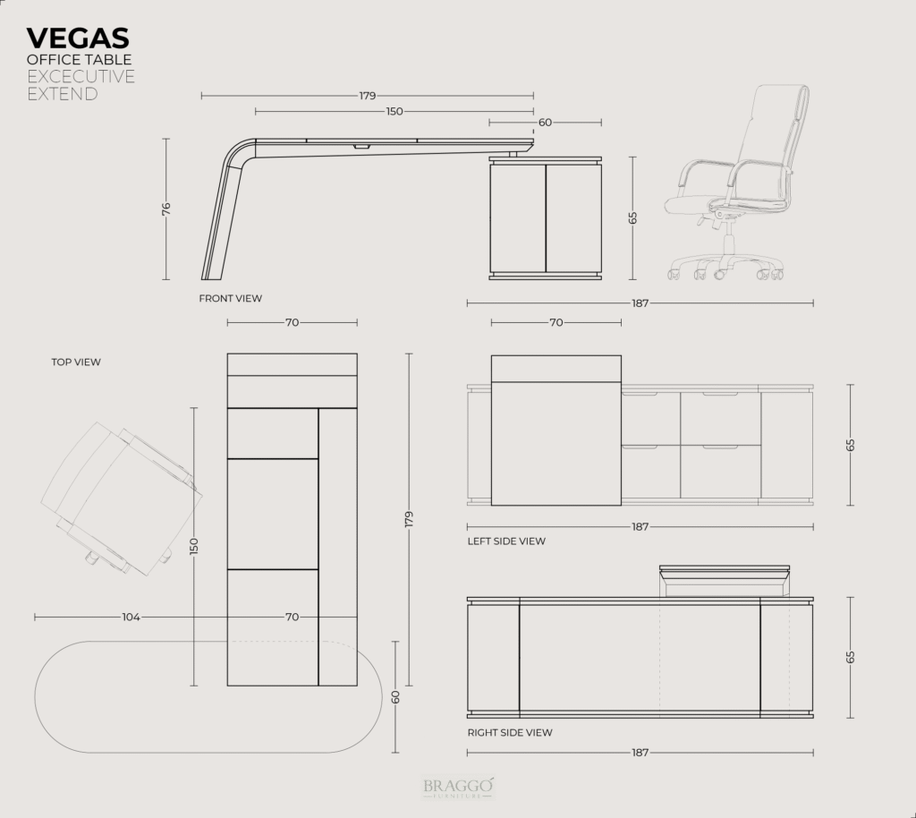VEGAS E SOTTSASS Ofis Masası, tablasının özel tasarımı ile heyecan verici bir görünüme sahiptir. Tablanın mono blok formu içi demir konstrüksiyon ile desteklenmiştir ve son dercee sağlamdır. Tabla üstü ve çekmece klapaları İtalyan ALPI markasının özel serisinden olan “Ettore Sottrass Grey” ahşap kaplaması ile yapılmıştır. Tabla üstünde evrak ve kalem saklamak için gizli kapağı vardır. Tabla altı ve kesonu mat lake cilalıdır. Kesonu 4 çekmeli ve tek kapaklı dolaplıdır. Çekmeceler tam açılım tandem raylıdır.