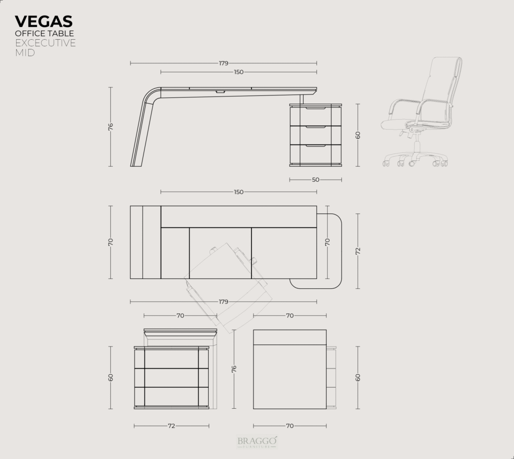 VEGAS E SOTTSASS Ofis Masası, tablasının özel tasarımı ile heyecan verici bir görünüme sahiptir. Tablanın mono blok formu içi demir konstrüksiyon ile desteklenmiştir ve son derece sağlamdır. Tabla üstü ve çekmece klapaları İtalyan ALPI markasının özel serisinden olan “Ettore Sottrass Grey” ahşap kaplaması ile yapılmıştır. Tabla üstünde evrak ve kalem saklamak için gizli kapağı vardır. Tabla altı ve kesonu mat lake cilalıdır. Kesonu 3 çekmelidir. Çekmeceler tam açılım tandem raylıdır.