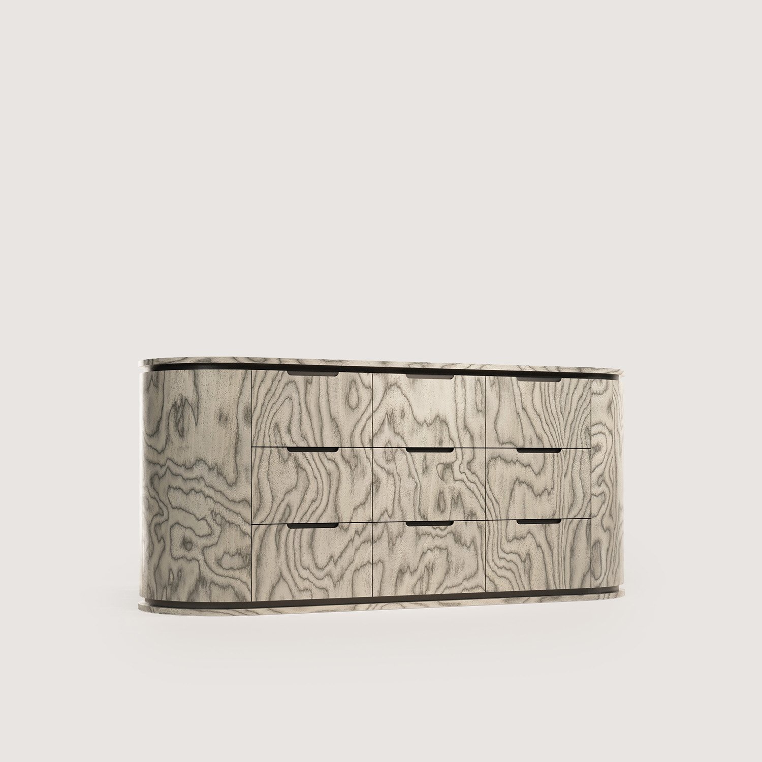 VEGAS E SOTTSASS 9 Çekmeceli Şifonyer, bombeli yapısıyla modern bir görünüme sahiptir. İtalyan ALPI markasının özel serisinden olan “Ettore Sottrass Grey” ahşap kaplaması ile son derece özel bir dokusu vardır. Arka kısmı da ön kısmı ile aynı şekilde devam ettiğinden duvara yaslanmasına gerek olmadan kullanılabilir. 9 çekmecelidir. Çekmeceler, tam açılım tandem raylıdır.