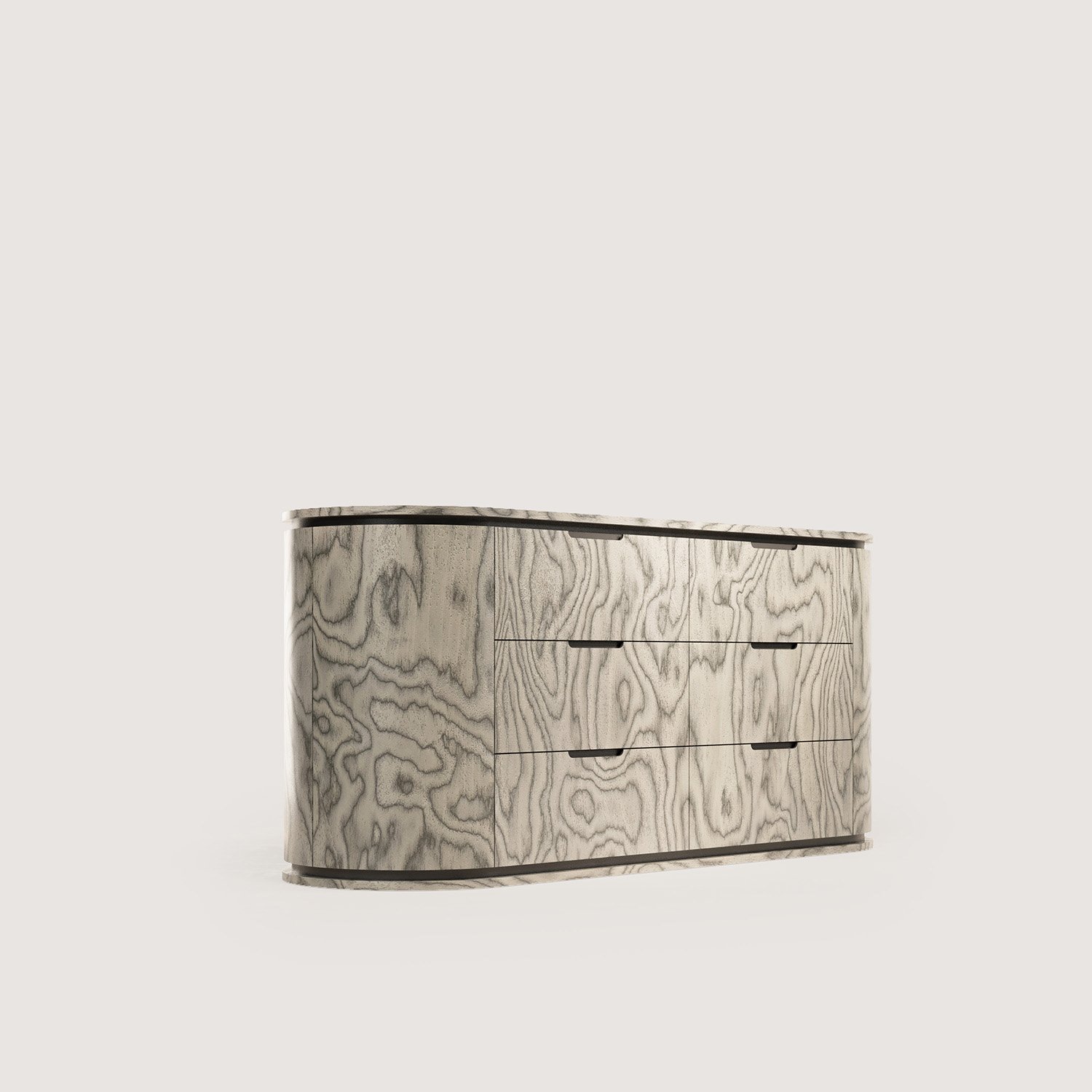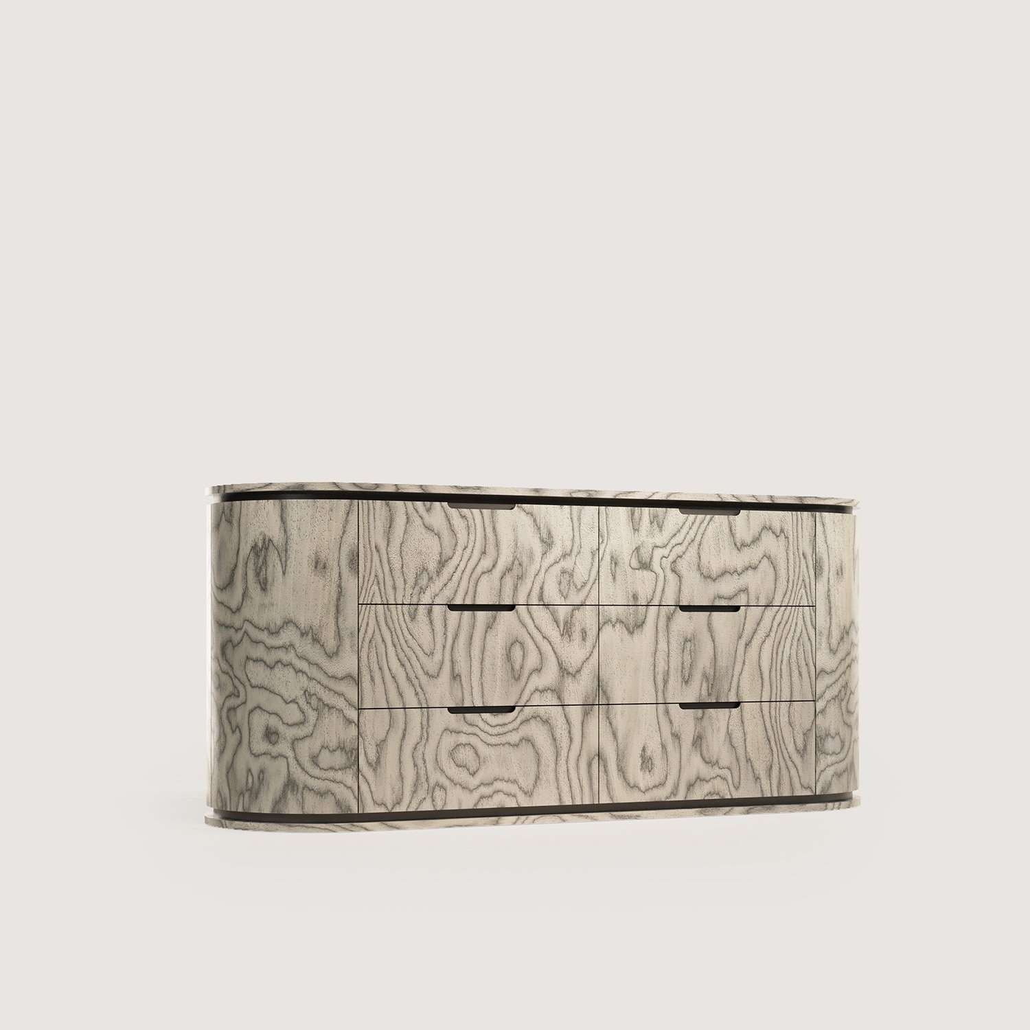 VEGAS E SOTTSASS 6 Çekmeceli Şifonyer, bombeli yapısıyla modern bir görünüme sahiptir. İtalyan ALPI markasının özel serisinden olan “Ettore Sottrass Grey” ahşap kaplaması ile son derece özel bir dokusu vardır. Arka kısmı da ön kısmı ile aynı şekilde devam ettiğinden duvara yaslanmasına gerek olmadan kullanılabilir. 6 çekmecelidir. Çekmeceler, tam açılım tandem raylıdır.