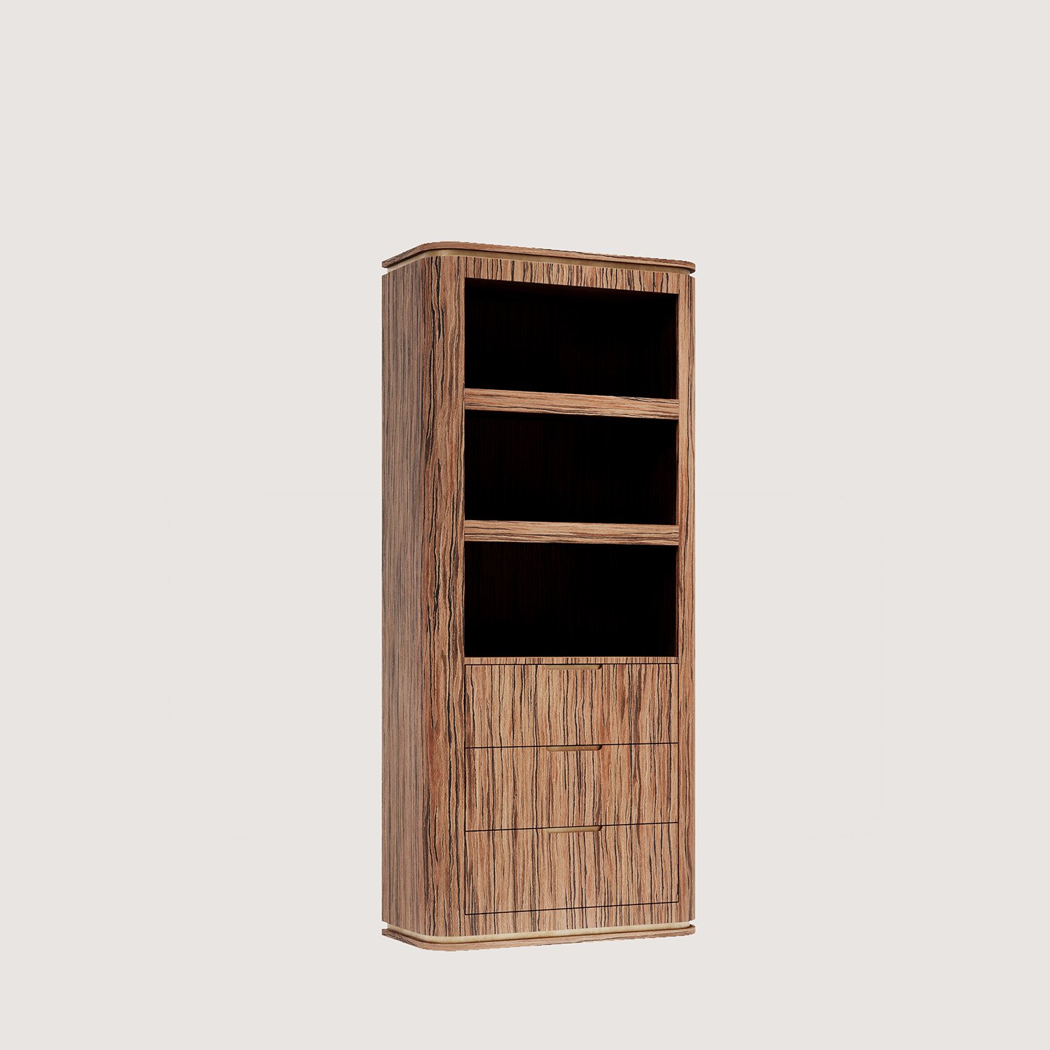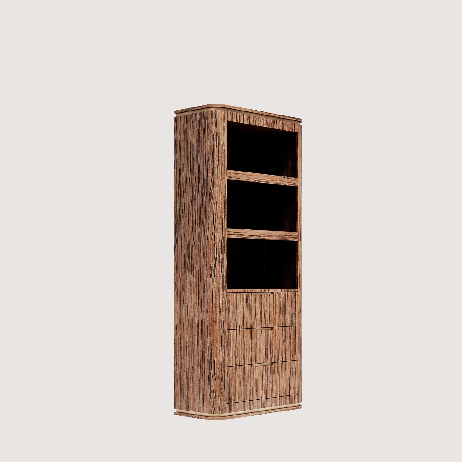 VEGAS JAPANESE CEDAR Çekmeceli Kitaplık, köşelerinin bombeli yapısıyla modern bir görünüme sahiptir. İtalyan ALPI markasının özel serisinden olan “JAPANESE Cedar” ahşap kaplaması ile son derece özel bir dokusu vardır. Çekmeceleri ile çok amaçlı kullanıma olanak tanır. Çekmeceler tam açılım tandem raylıdır.