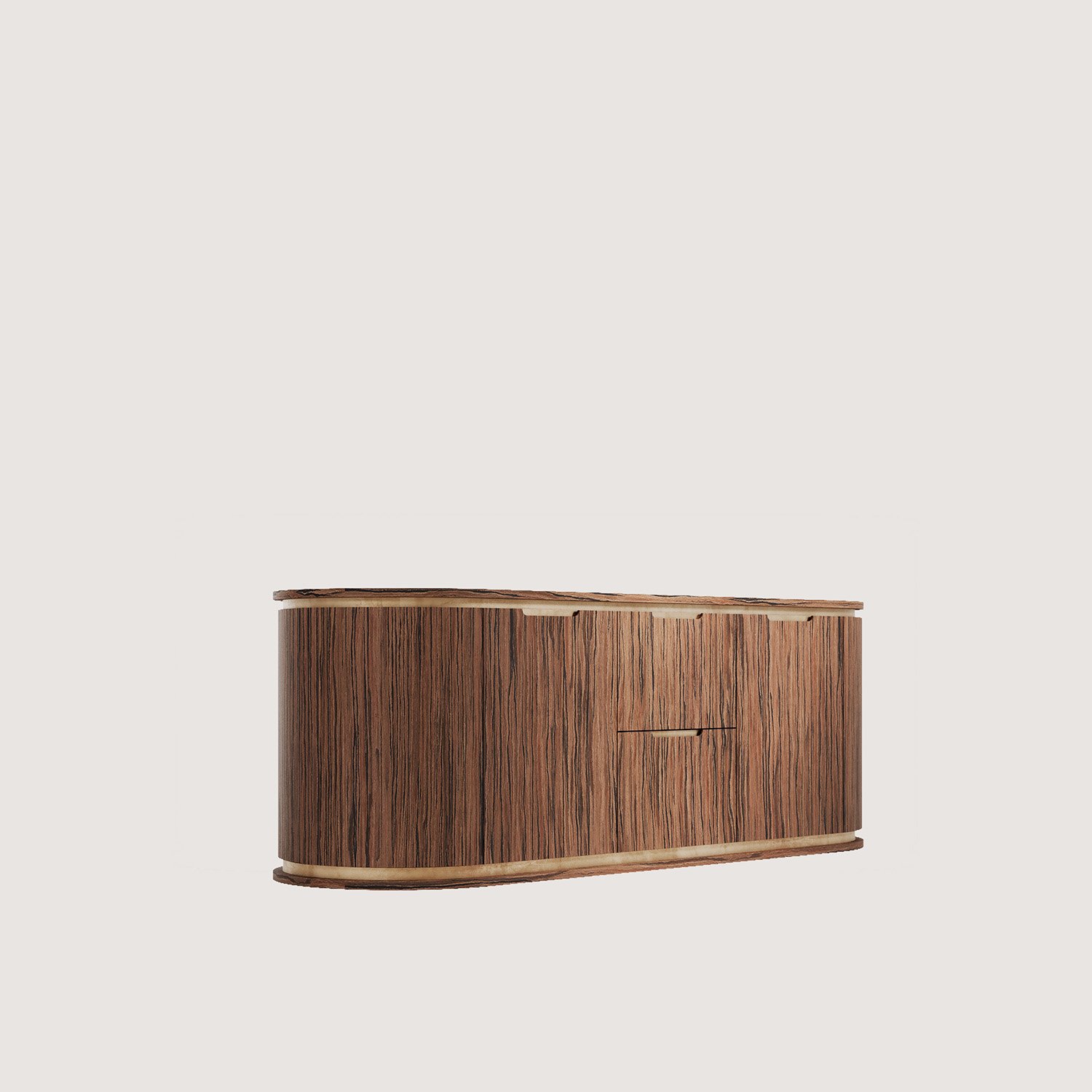 VEGAS JAPANESE CEDAR TV Sehpası, bombeli yapısıyla modern bir görünüme sahiptir. İtalyan ALPI markasının özel serisinden olan “JAPANESE Cedar” ahşap kaplaması ile son derece özel bir dokusu vardır. Arka kısmı da ön kısmı ile aynı şekilde devam ettiğinden duvara yaslanmasına gerek olmadan kullanılabilir. Orta iki sırası tam açılım tandem raylı çekmecelidir. Çekmece yanları bombe içine kadar kapaklı dolaptır.