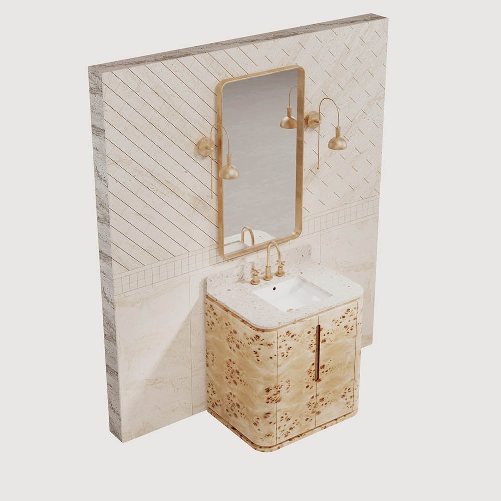 VEGAS MAZEL Banyo Lavabo Dolabı, köşeleri bombeli yapısıyla modern bir görünüme sahiptir. Mazel ağacının kendine has dokusu ile özel bir görünüme sahiptir. Lavabo altı 2 kapaklıdır. Tezgah ve süpürgelik son derece dayanıklı bir taş olan kuvarsdan imal edilir. Banyo dolabımızda, tezgah altı hilton tip seramik lavabo kullanılır. Ayna çerçevesi MDF üstü gold boyalıdır. Batarya ve sifon fiyata dahil değildir.