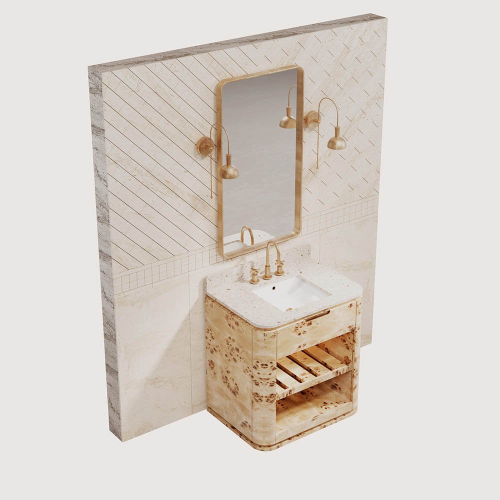 VEGAS MAZEL Banyo Lavabo Dolabı, köşeleri bombeli yapısıyla modern bir görünüme sahiptir. Mazel ağacının kendine has dokusu ile özel bir görünüme sahiptir. Lavabo altı tek çekmecelidir. Çekmece altları ızgaralı açık raflıdır. Bu raf bölümü LED aydınlatmalıdır. Tezgah ve süpürgelik son derece dayanıklı bir taş olan kuvarsdan imal edilir. Banyo dolabımızda, tezgah altı hilton tip seramik lavabo kullanılır. Ayna çerçevesi MDF üstü gold boyalıdır. Batarya ve sifon fiyata dahil değildir.