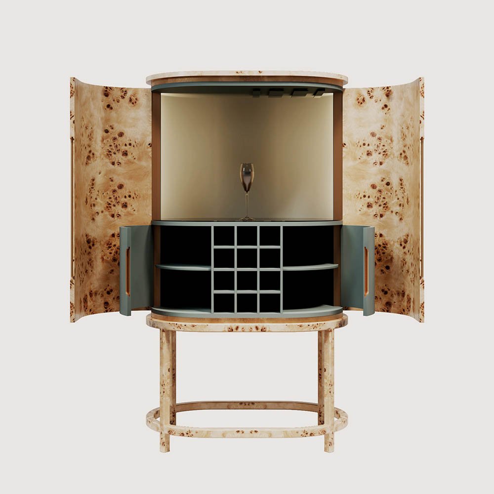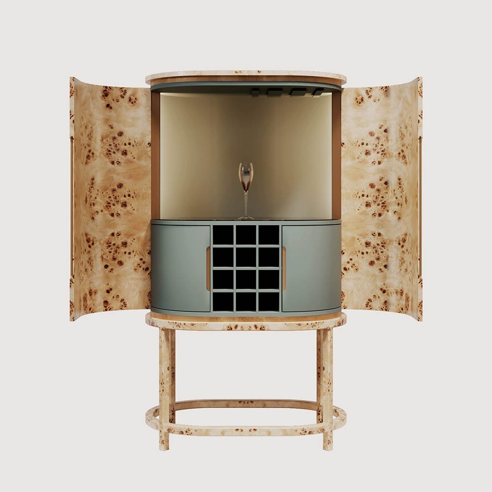 VEGAS MAZEL Bar Dolabı, bombeli yapısıyla modern bir görünüme sahiptir. Mazel ağacının kendine has dokusu ile özel bir görünüme sahiptir. Bu modern ve özel görünümü, altın renk bantlarla destekleyerek bar dolabına zarif bir hava katar.