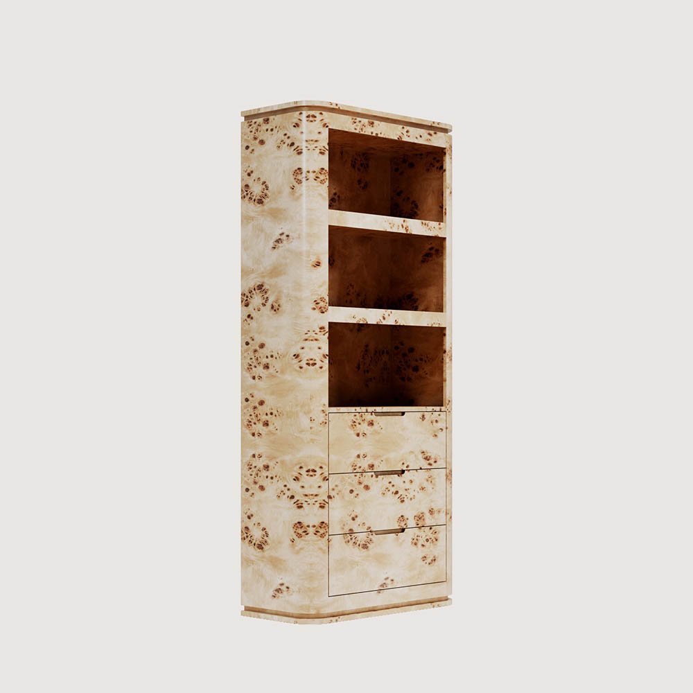 VEGAS MAZEL Çekmeceli Kitaplık, köşelerinin bombeli yapısıyla modern bir görünüme sahiptir. Mazel ağacının kendine has dokusu ile özel bir görünüme sahiptir. Çekmeceleri ile çok amaçlı kullanıma olanak tanır. Çekmeceler tam açılım tandem raylıdır.