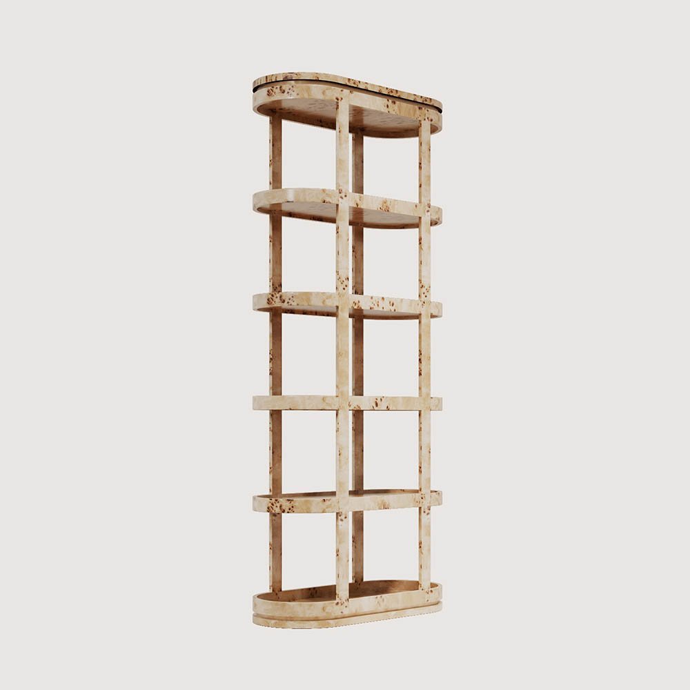 VEGAS MAZEL Kitaplık, bombeli yapısıyla modern bir görünüme sahiptir. Mazel ağacının kendine has dokusu ile özel bir görünüme sahiptir. Arka kısmı da ön kısmı ile aynı şekilde devam ettiğinden duvara yaslanmasına gerek olmadan kullanılabilir. 5 raflıdır.