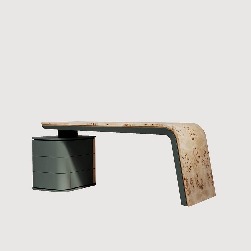 VEGAS MAZEL Ofis Masası, tablasının özel tasarımı ile heyecan verici bir görünüme sahiptir. Tablanın mono blok formu içi demir konstrüksiyon ile desteklenmiştir ve son dercee sağlamdır. Tabla üstü ve çekmece klapaları kendine has bir görünümü olan mazel ağaç kaplama ile yapılmıştır. Tabla üstünde evrak ve kalem saklamak için gizli kapağı vardır. Tabla altı ve kesonu mat lake cilalıdır. Kesonu 3 çekmelidir. Çekmeceler tam açılım tandem raylıdır.