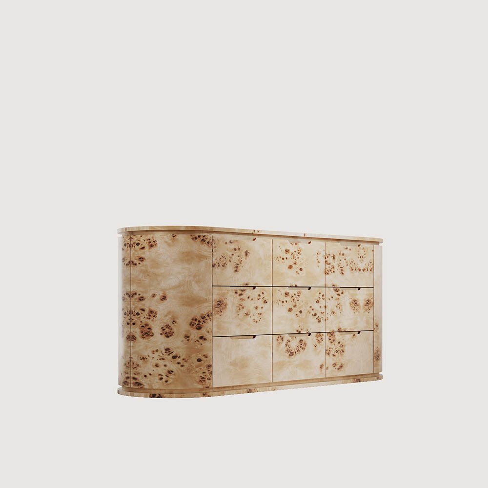 VEGAS MAZEL 9 Çekmeceli Şifonyer, bombeli yapısıyla modern bir görünüme sahiptir. Mazel ağacının kendine has dokusu ile özel bir görünüme sahiptir. Arka kısmı da ön kısmı ile aynı şekilde devam ettiğinden duvara yaslanmasına gerek olmadan kullanılabilir. 9 çekmecelidir. Çekmeceler, tam açılım tandem raylıdır.