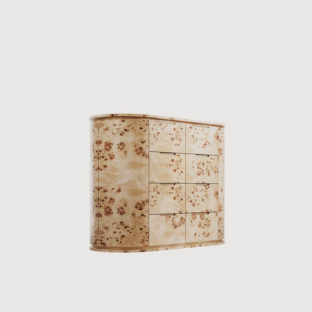 VEGAS MAZEL 6 Çekmeceli Şifonyer, bombeli yapısıyla modern bir görünüme sahiptir. Mazel ağacının kendine has dokusu ile özel bir görünüme sahiptir. Arka kısmı da ön kısmı ile aynı şekilde devam ettiğinden duvara yaslanmasına gerek olmadan kullanılabilir. 6 çekmecelidir. Çekmeceler, tam açılım tandem raylıdır.